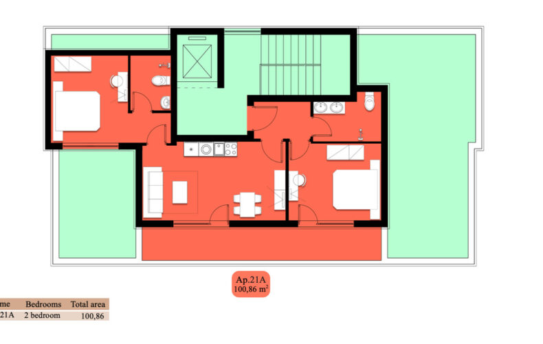 Na ostatnim piętrze znajduje się jeden duży penthouse o powierzchni liczącej ponad ponad 100m2 położony w budynku A. Nieruchomość łączy w sobie przestrzeń, światło i poczucie absolutnej prywatności. To jedyny taki apartament w budynku stworzony z myślą o najbardziej wymagających.
