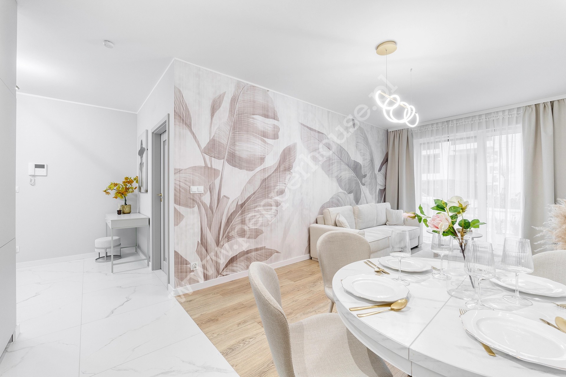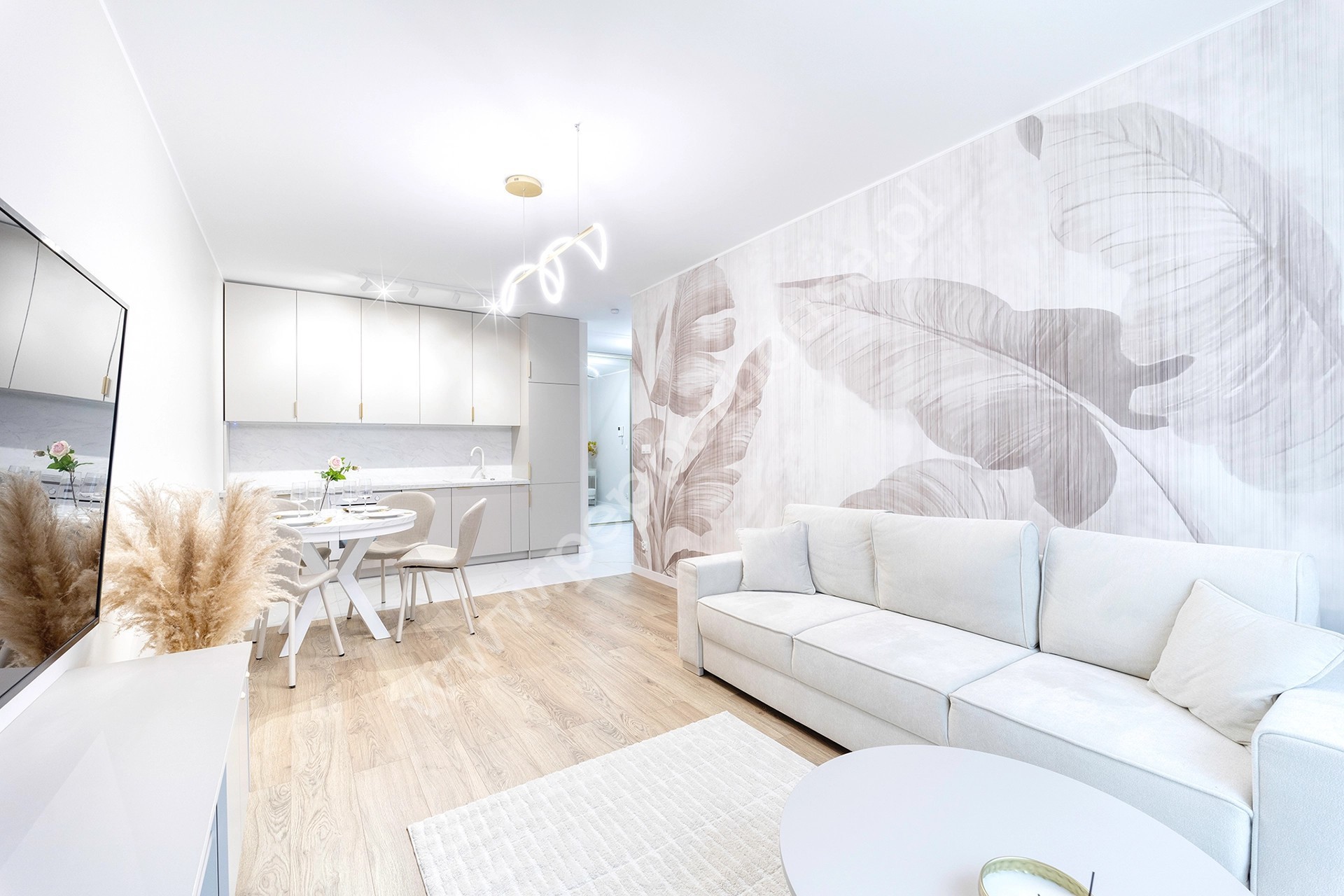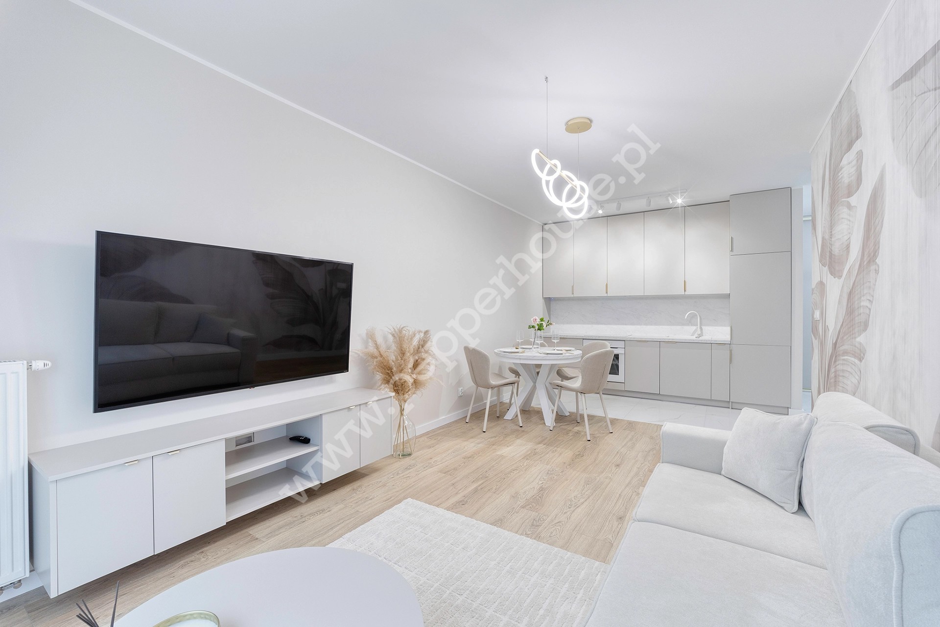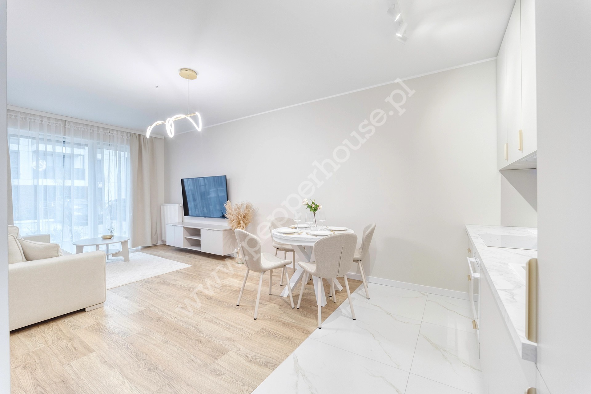 Na sprzedaż 2 pokojowy apartament z ogródkiem ulokowany w nowej inwestycji uznanego dewelopera LEM-BUD -osiedle Panorama Wiślana! Mieszkanie cechuje się wykończeniem materiałami wysokiej jakości, z dbałością o każdy detal. Zabudowa kuchenna oraz szafy w zabudowie w sypialni i przedpokoju robione na wymiar przez zaufanego stolarza, nowe meble i sprzęty AGD (lodówka, płyta indukcyjna, okap, zmywarka). Przemyślany projekt wnętrza, w którym zadbano o każdy szczegół, tworzy harmonijną i funkcjonalną przestrzeń. Połączenie ciepłych beży, naturalnego drewna, nowoczesnego oświetlenia i gustownych dodatków tworzy poczucie przytulności, przy zachowaniu przestronności pomieszczeń.
