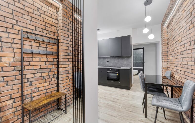 – Salon z aneksem kuchennym – przestronny z dużym oknem i miejscem na jadalnię,