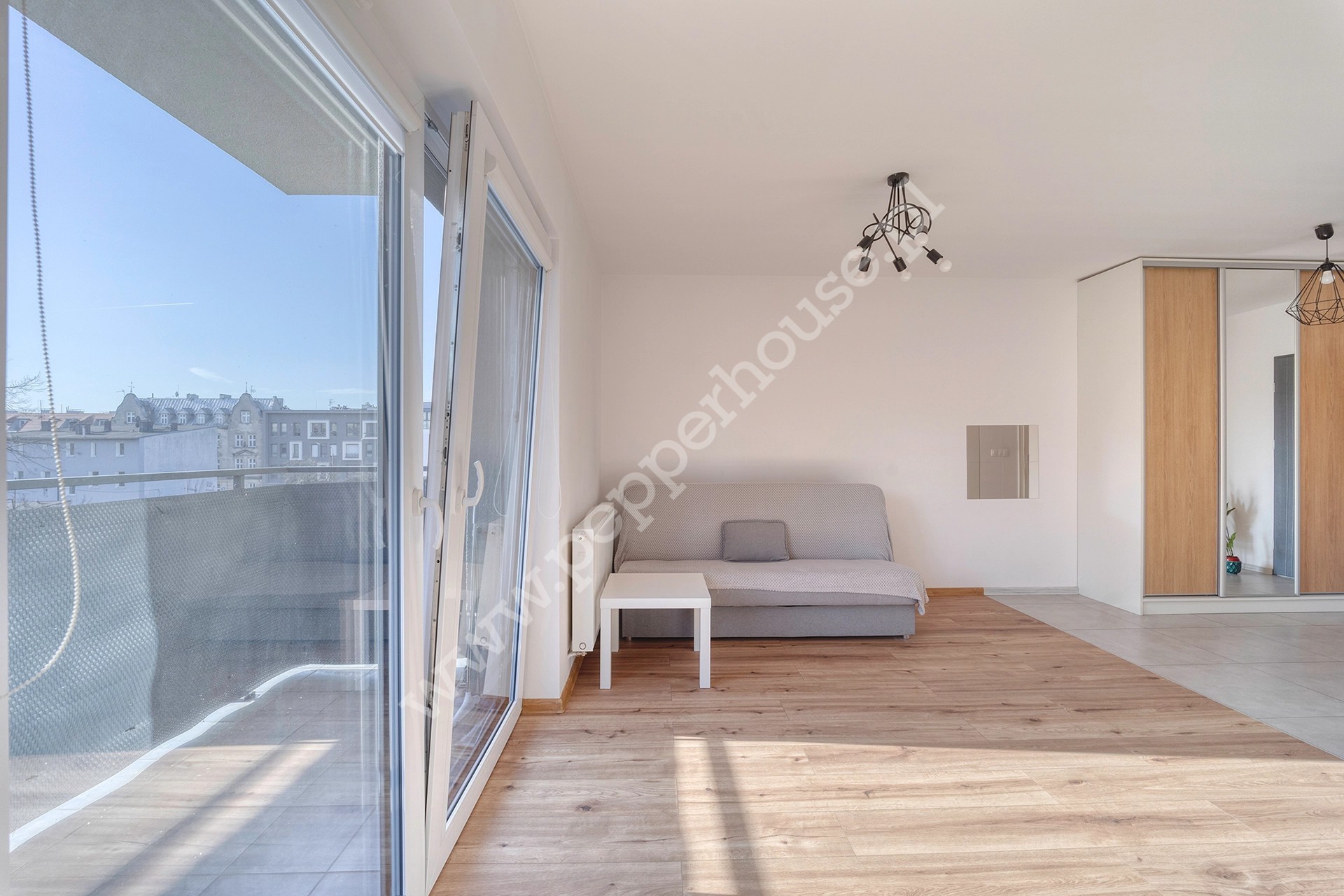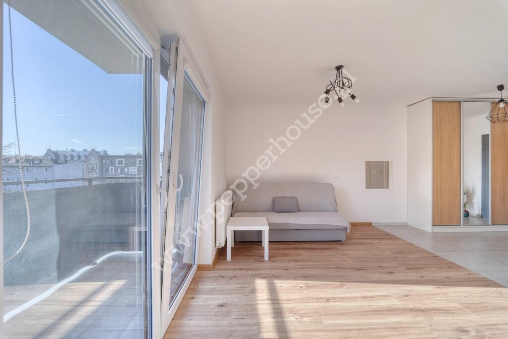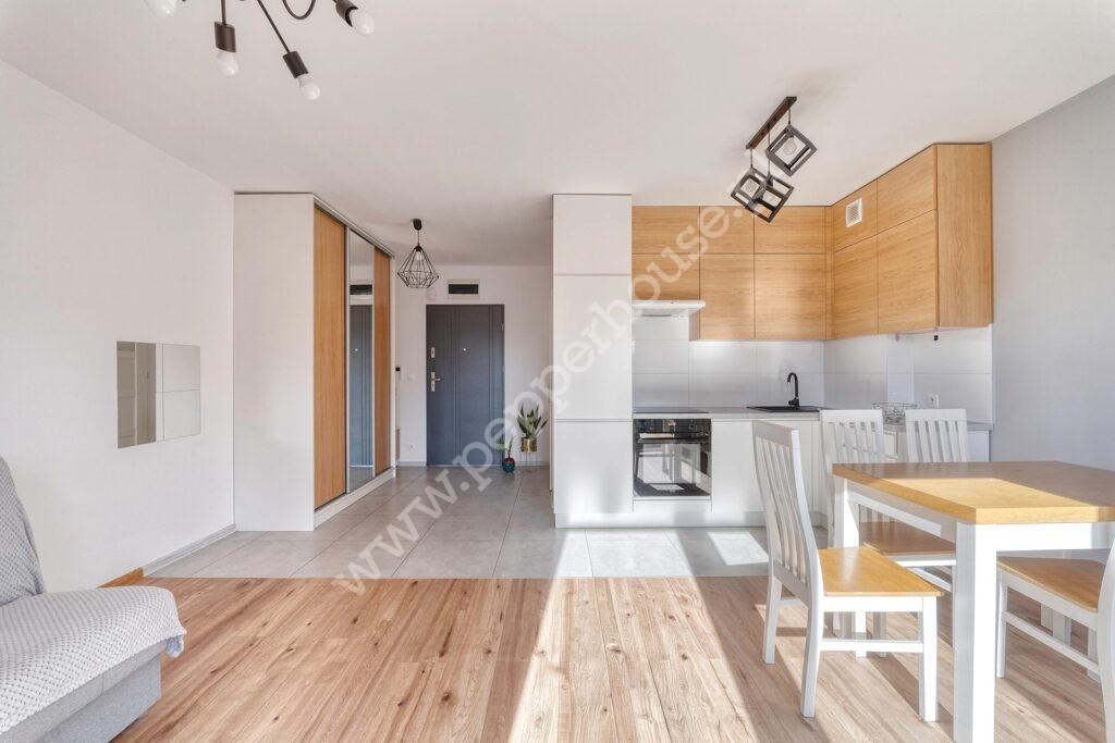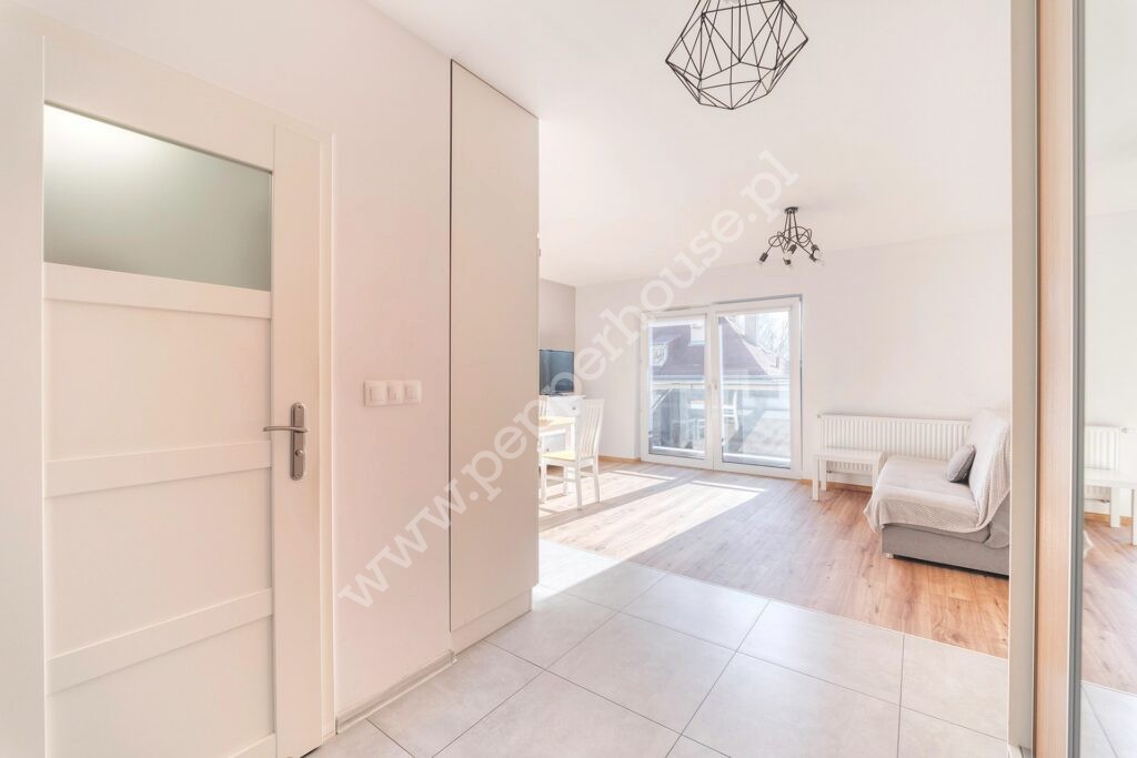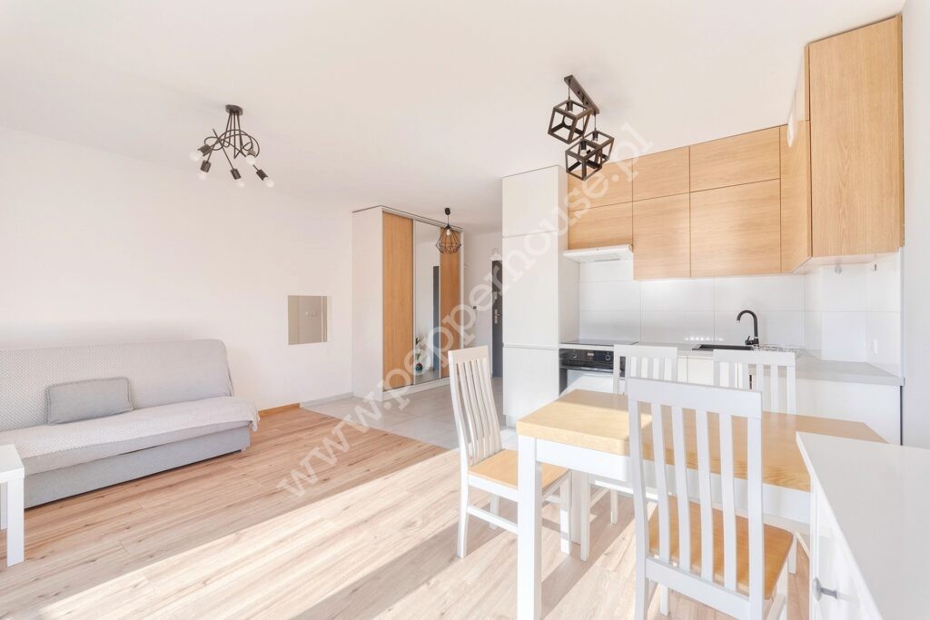 Lokal usytuowany na drugim piętrze w budynku z windą. Kawalerka jest w pełni wyposażona. Aneks kuchenny z pełną zabudową i sprzętem AGD (lodówka, zmywarka, płyta indukcyjna, piekarnik i okap). W drugiej części znajdziemy sporą szafę, stół, krzesła i rozkładaną sofę. Łazienka wyposażona w prysznic typu walk-in oraz pralkę.