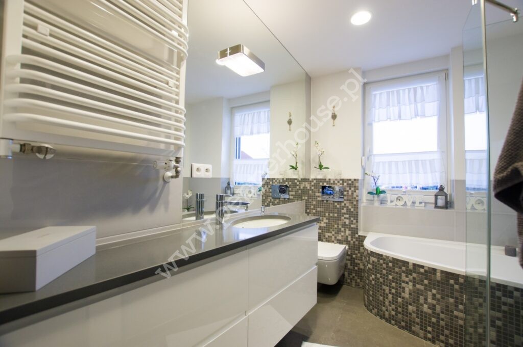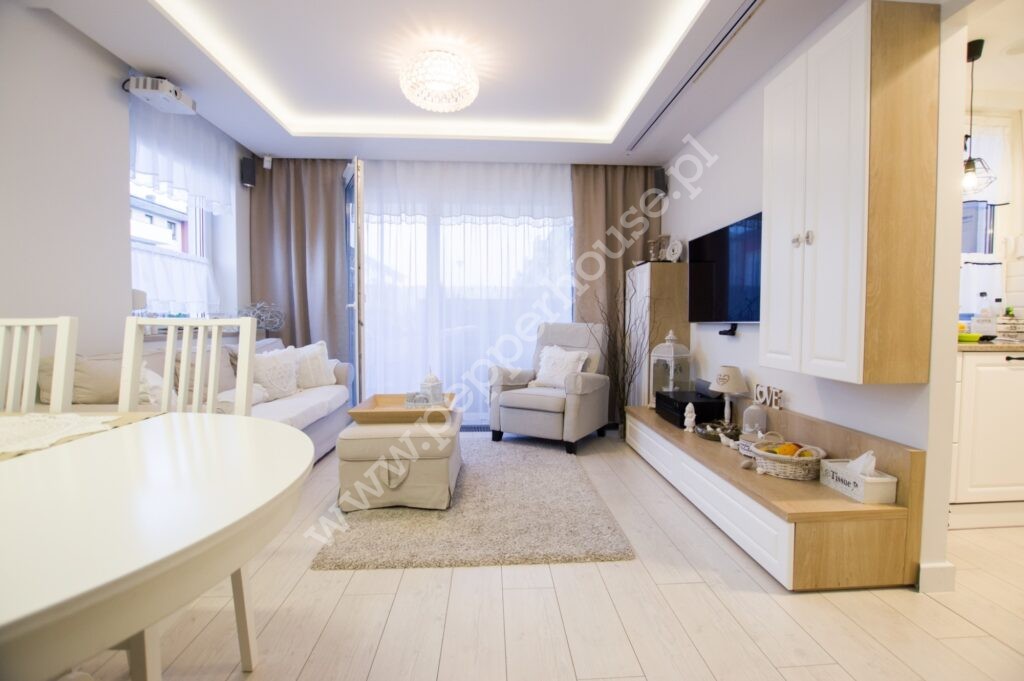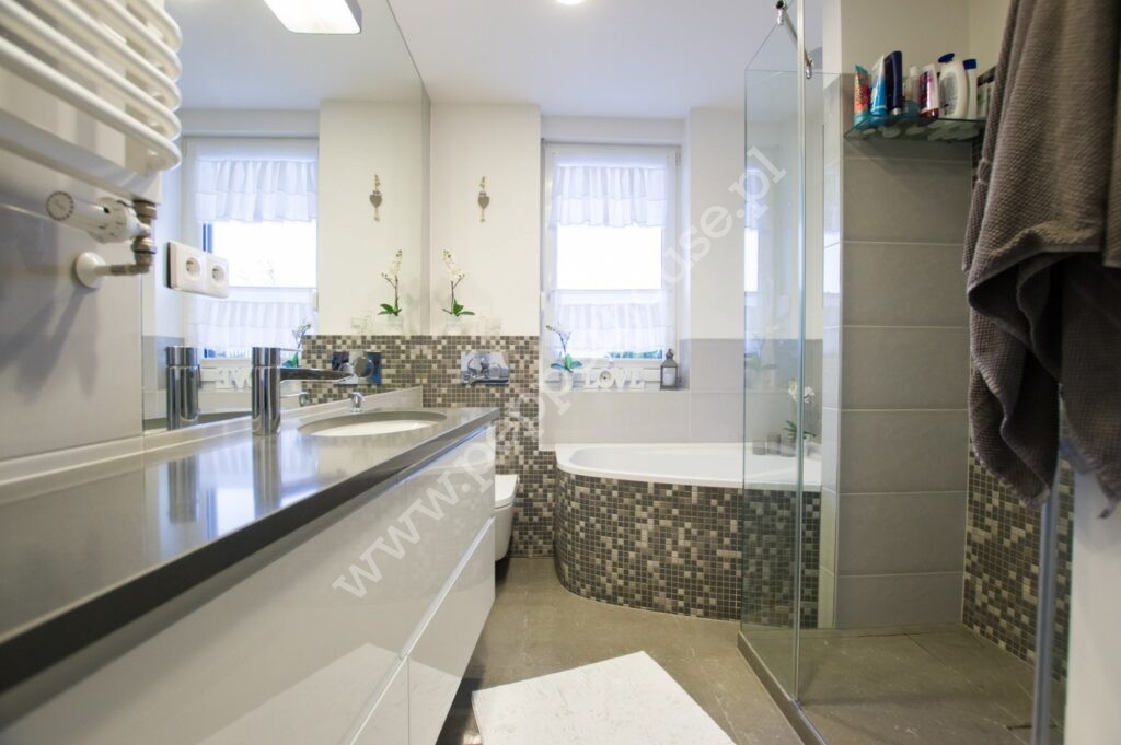 Z salonu oraz z sypialni jest możliwość wyjścia na duży ogród (ok. 200 m2). Ogród jest zadbany. Posiada automatyczny tryb nawadniania oraz taras od strony południowej. Łazienka została tak zaprojektowana, aby zmieściła się tam wanna i kabina prysznicowa. Kuchnia z oknem jest jasna i funkcjonalna. Meble są praktycznie nowe – zostały wstawione około rok temu. Istnieje możliwość otworzenia jej na salon. Mieszkanie zostało gustownie wykończone materiałami wysokiej klasy. Dbałość o szczegóły i praktyczne rozwiązania widoczne są w wielu pomieszczeniach. W oknach założono rolety, a w mieszkaniu funkcjonuje instalacja alarmowa.