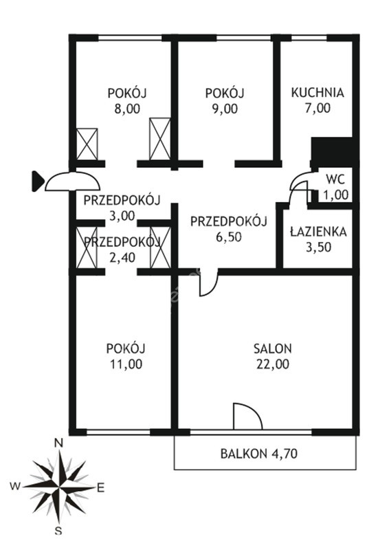Mieszkanie usytuowane jest na ostatnim z czterech pięter. Bardzo czyste i zadbane. Składa się z: kuchni (7), przedpokoju podzielonego na 3 niezależne powierzchnie (z zabudową), oddzielnej łazienki i WC, 4 pokoi (22, 11, 9, 8), z salonu wyjście na zabudowany balkon w stylu loggia i zabudowa Komandora w sypialni. Podwójna ekspozycja, pn. – pd. świetnie doświetla i nagrzewa lokal. Do Nieruchomości przynależy duża piwnica 10m2. Zawsze dostępne miejsca parkingowe przed budynkiem. Czynsz w skali miesiąca wynosi około 600 złotych (zaliczka na wodę i C.O.) plus prąd i gaz. Elewacja budynku i klatka schodowa po remoncie.
