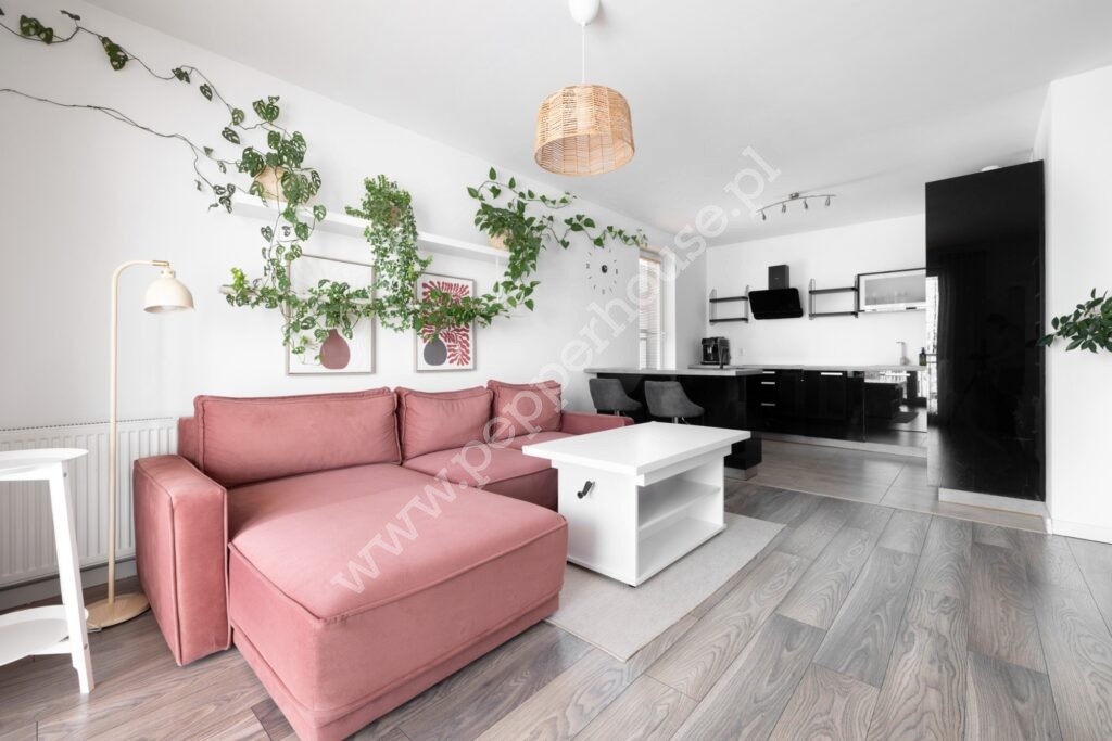 salon z aneksem kuchennym oraz wyjściem na balkon