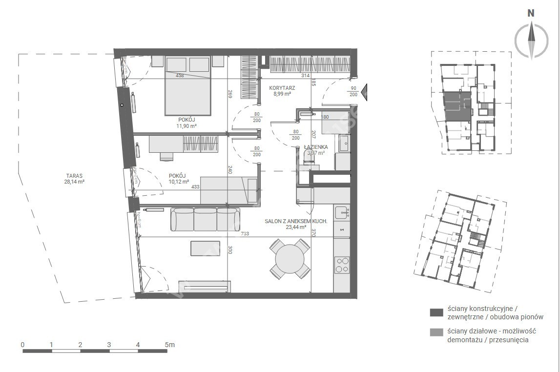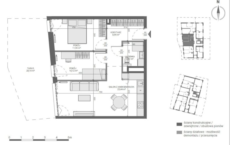 – salonu z aneksem kuchennym 23,44 m2