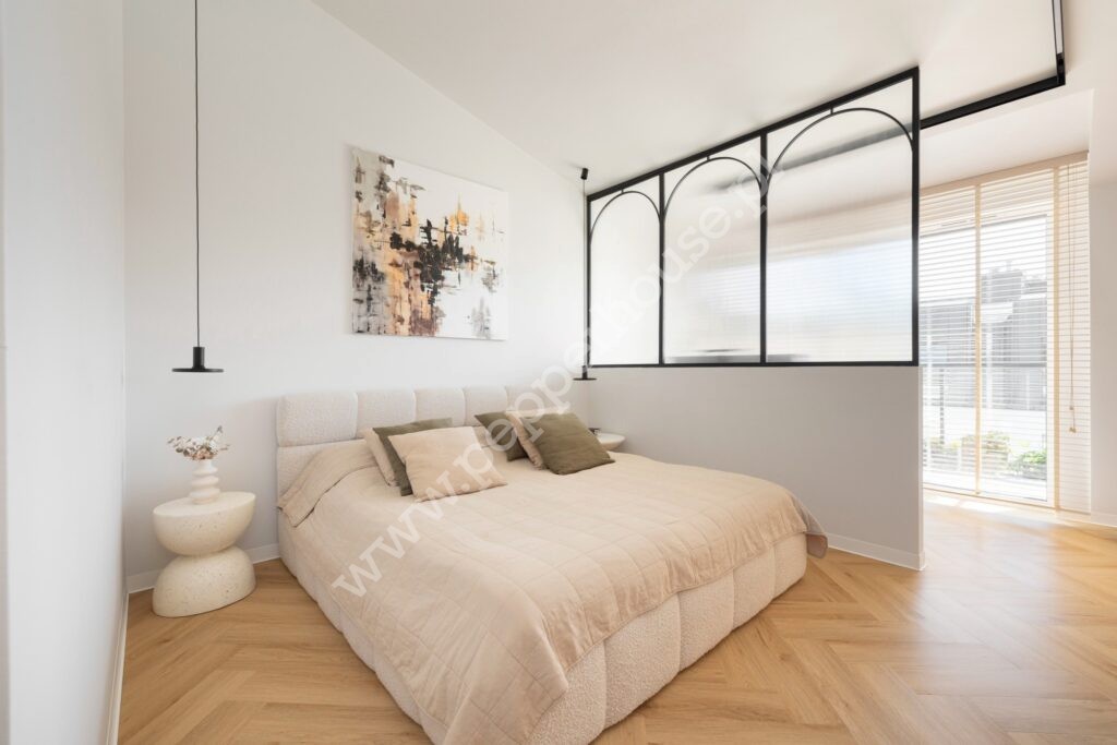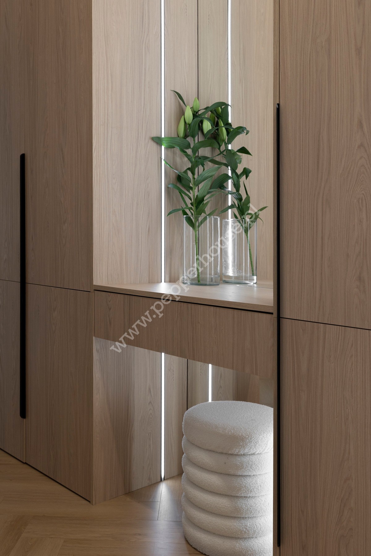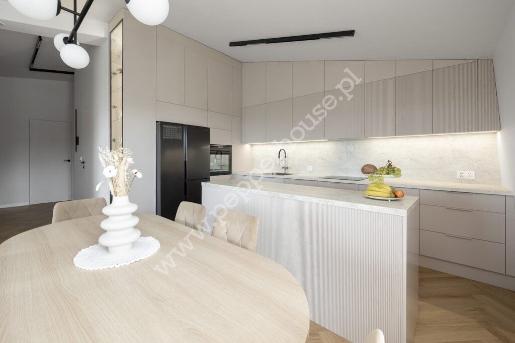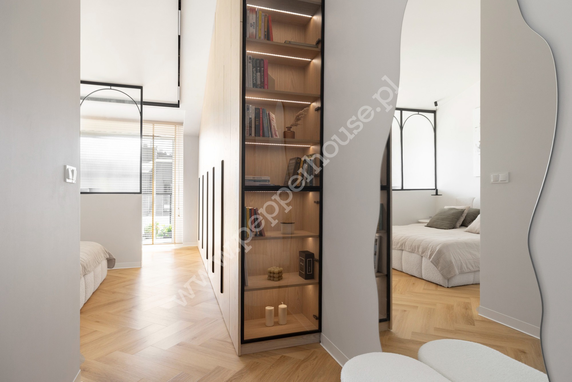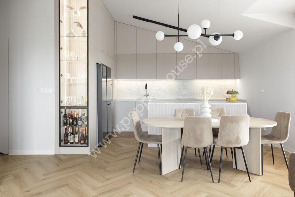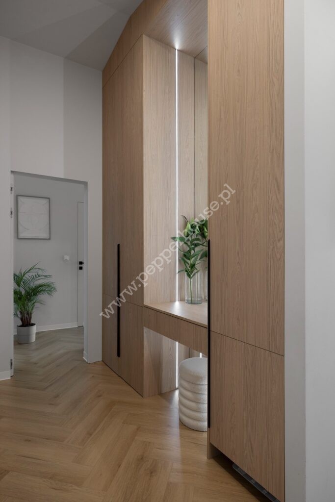 W mieszkaniu znajdują się eleganckie, ukryte drzwi DRE o wysokości 220 cm, osadzone na potrójnych zawiasach – subtelny detal, który podkreśla wysoką klasę wykończenia.