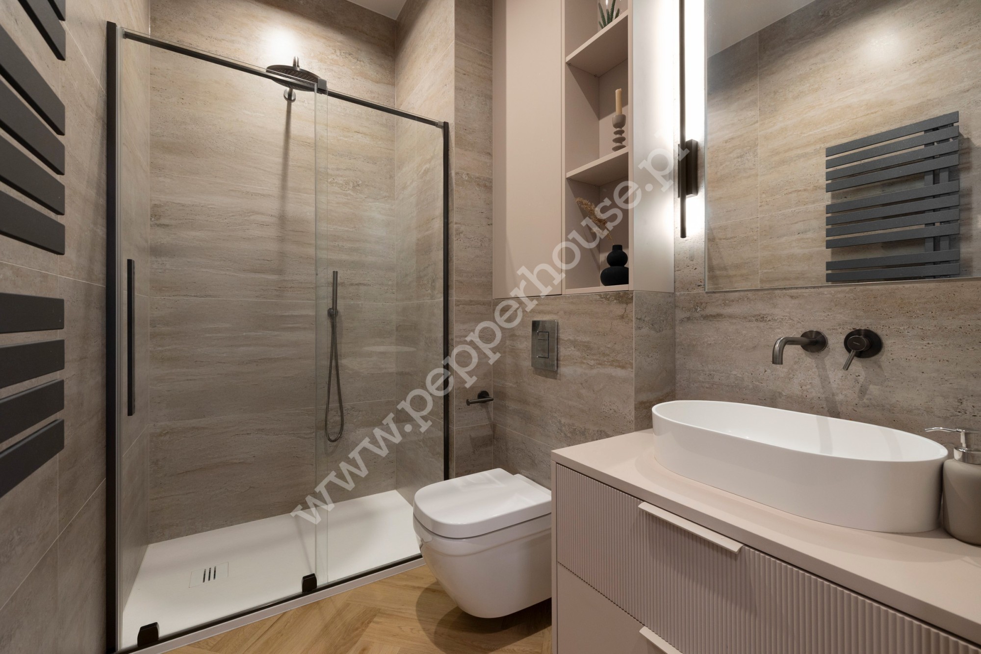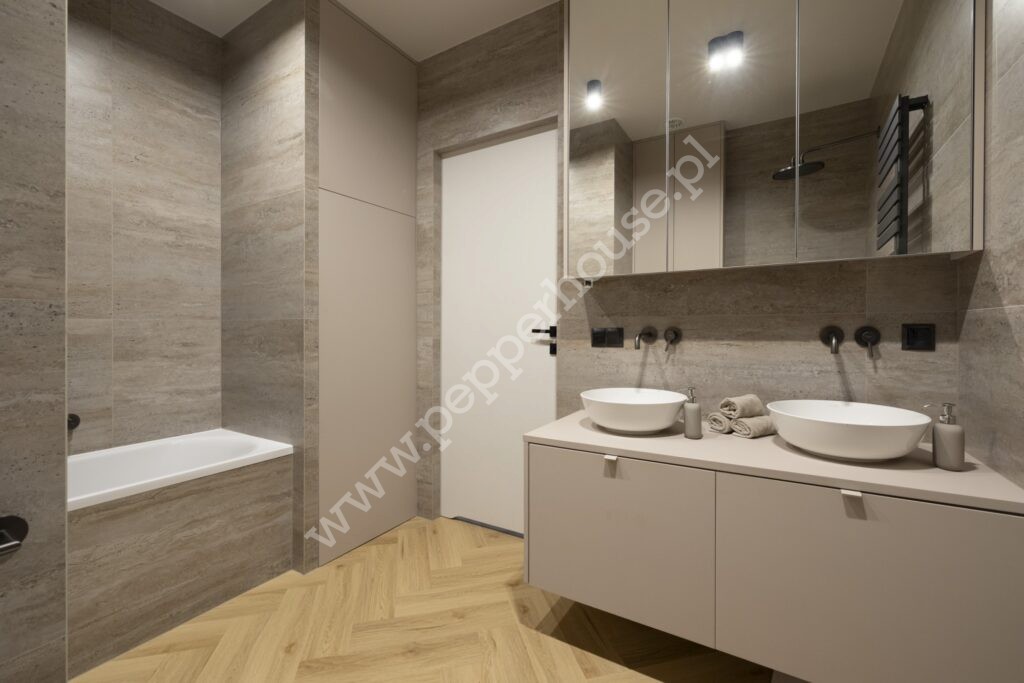 – Dwie eleganckie łazienki – jedna z prysznicem, druga z wanną i prysznicem, wyposażone w armaturę renomowanych marek.
