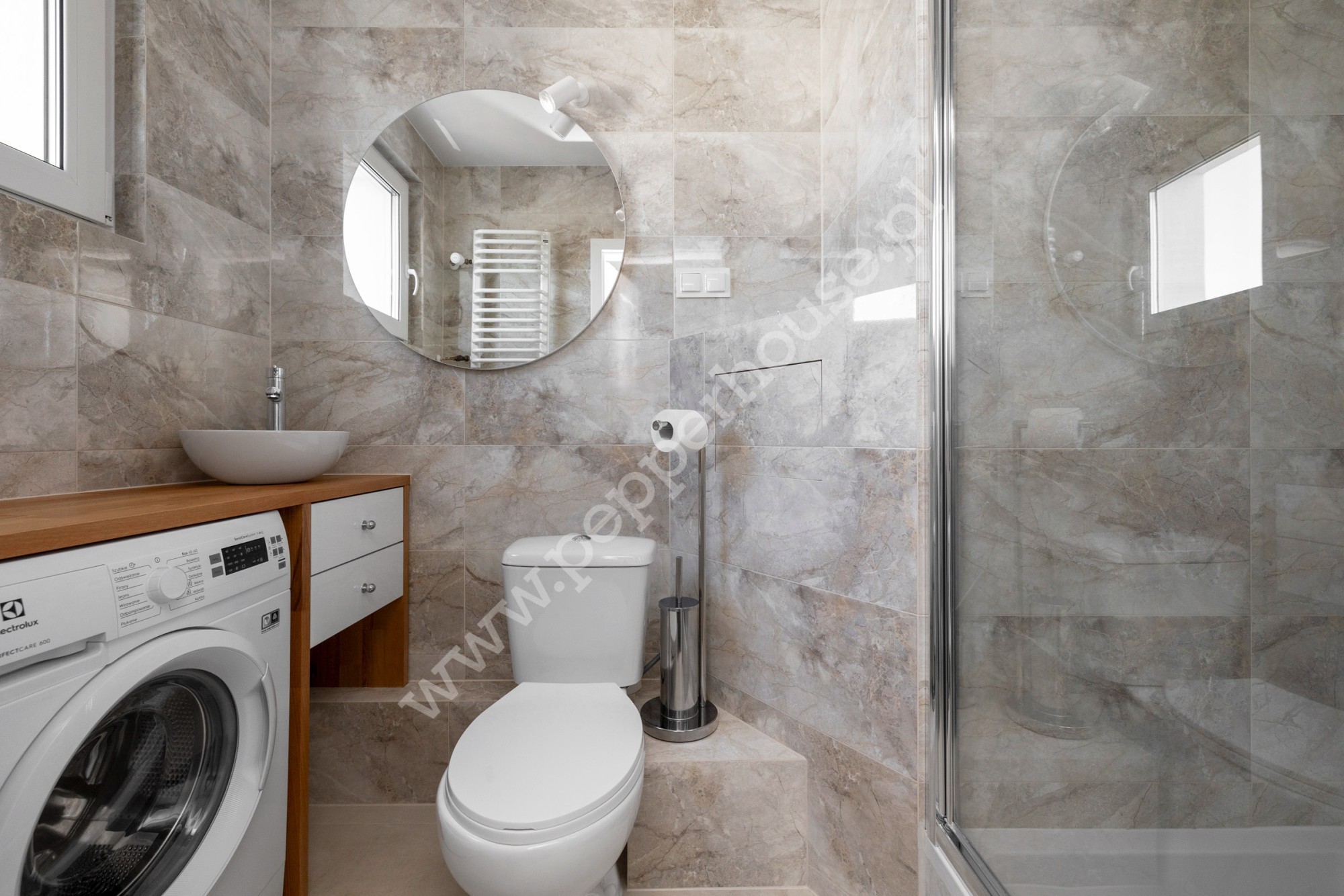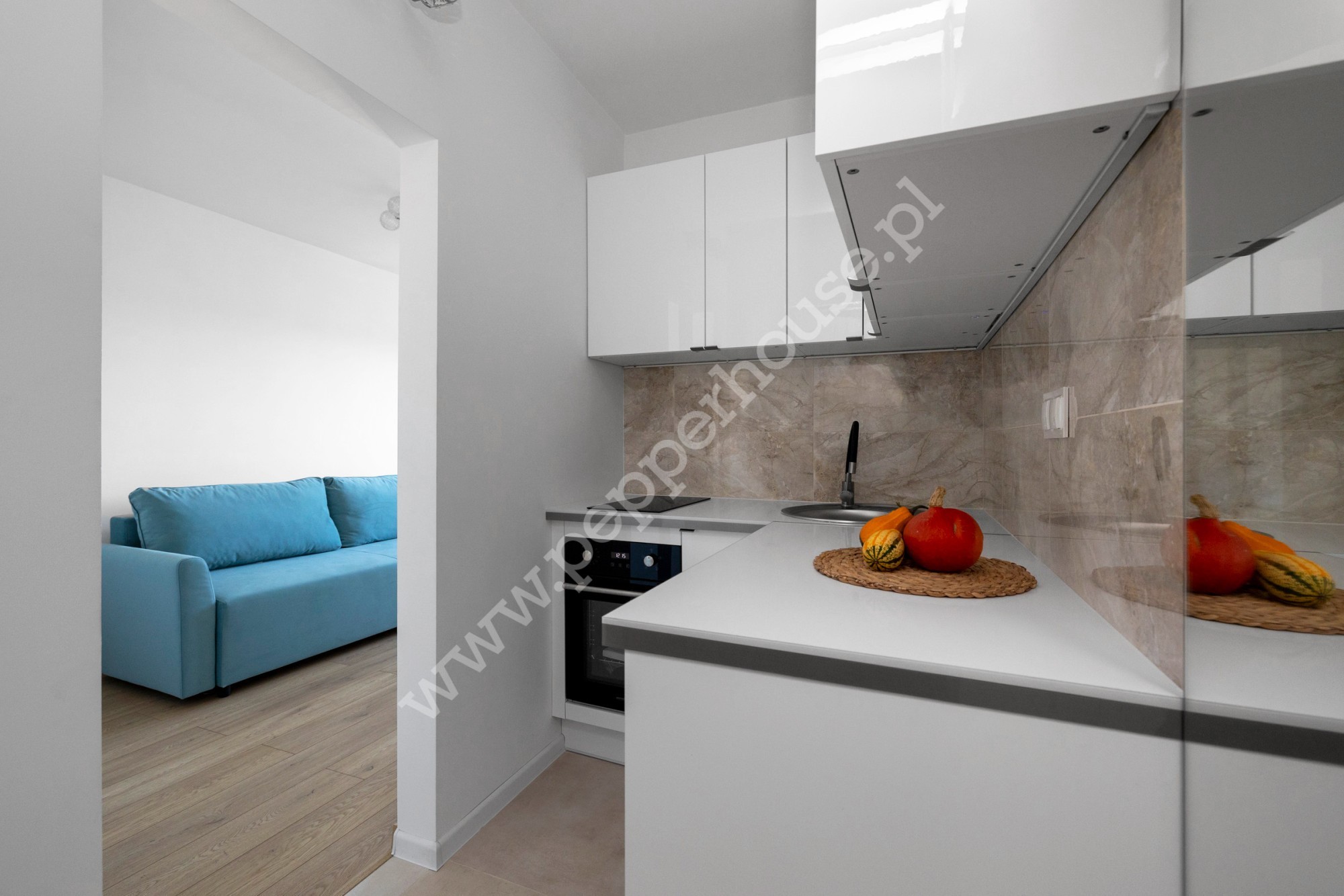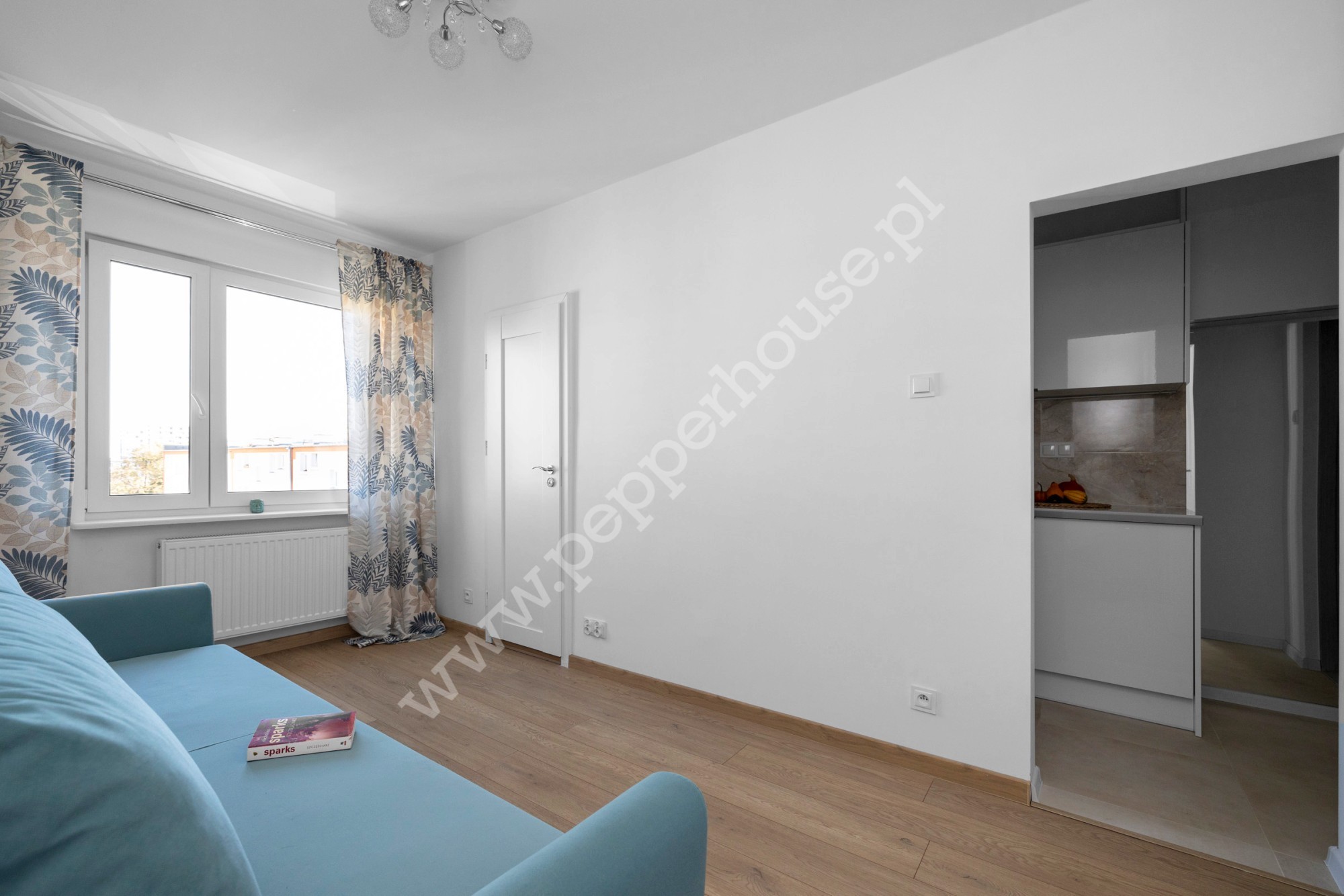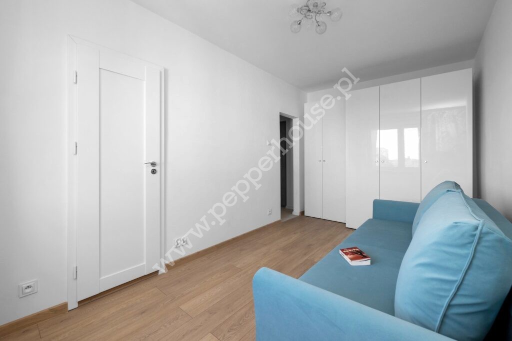 Dzięki przeprowadzonym zmianom aranżacyjnym ścian, kawalerka jest o wiele bardziej funkcjonalna i sprawia wrażenie większej. Uzyskana została przestrzeń na dwie szafy, w kuchni zastosowano innowacyjne wyposażenie szuflad. Dobór blatu w kuchni sprawił, że pomieszczenie zostało dodatkowo doświetlone poprzez odbijające się światło ledowe. Łazienka z oknem wyposażona jest w deszczownicę. Zadbano również o dodatki dekoratorskie, m.in. kryształki przy lampach konweniują z uchwytami do szaf.