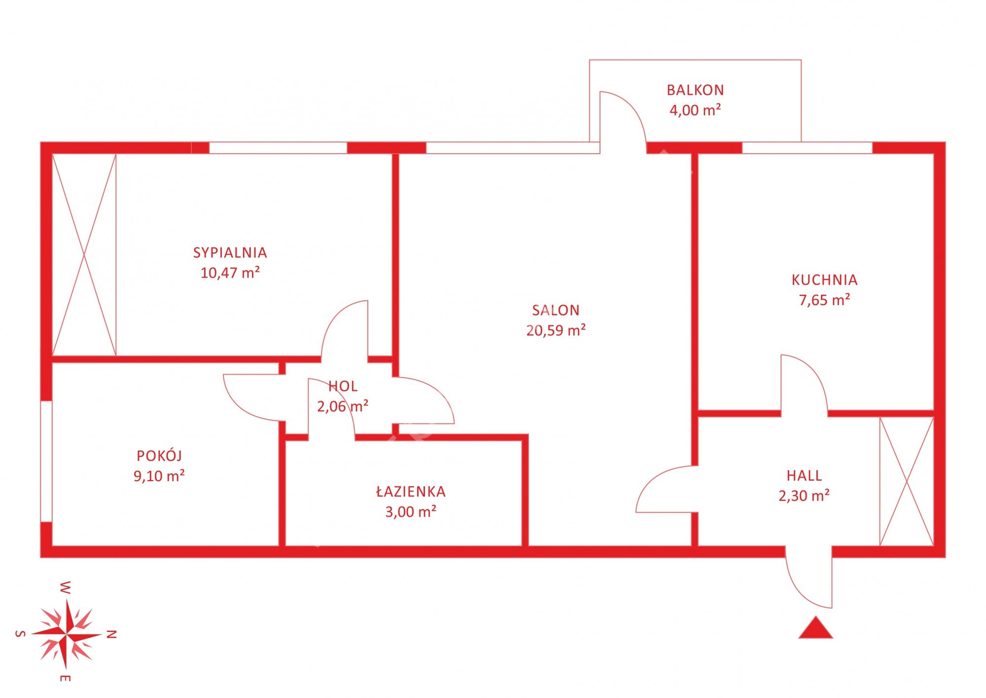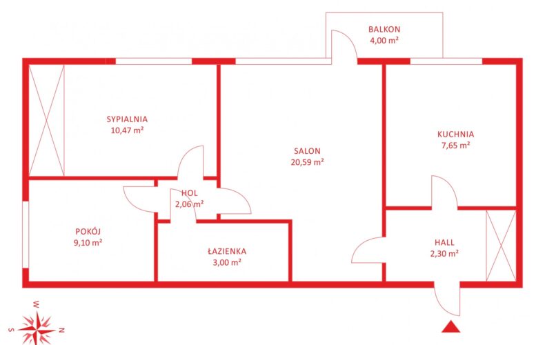 Lokal o powierzchni 57,17 m2 składa się z salonu (20,59m2) z wyjściem na balkon ok (3m2), sypialni (10,47 m2) łazienki (3m2) kolejnego ustawnego pokoju (9,10m2) oraz dwóch przedpokoi z czego jeden z wnęką pod szafę.