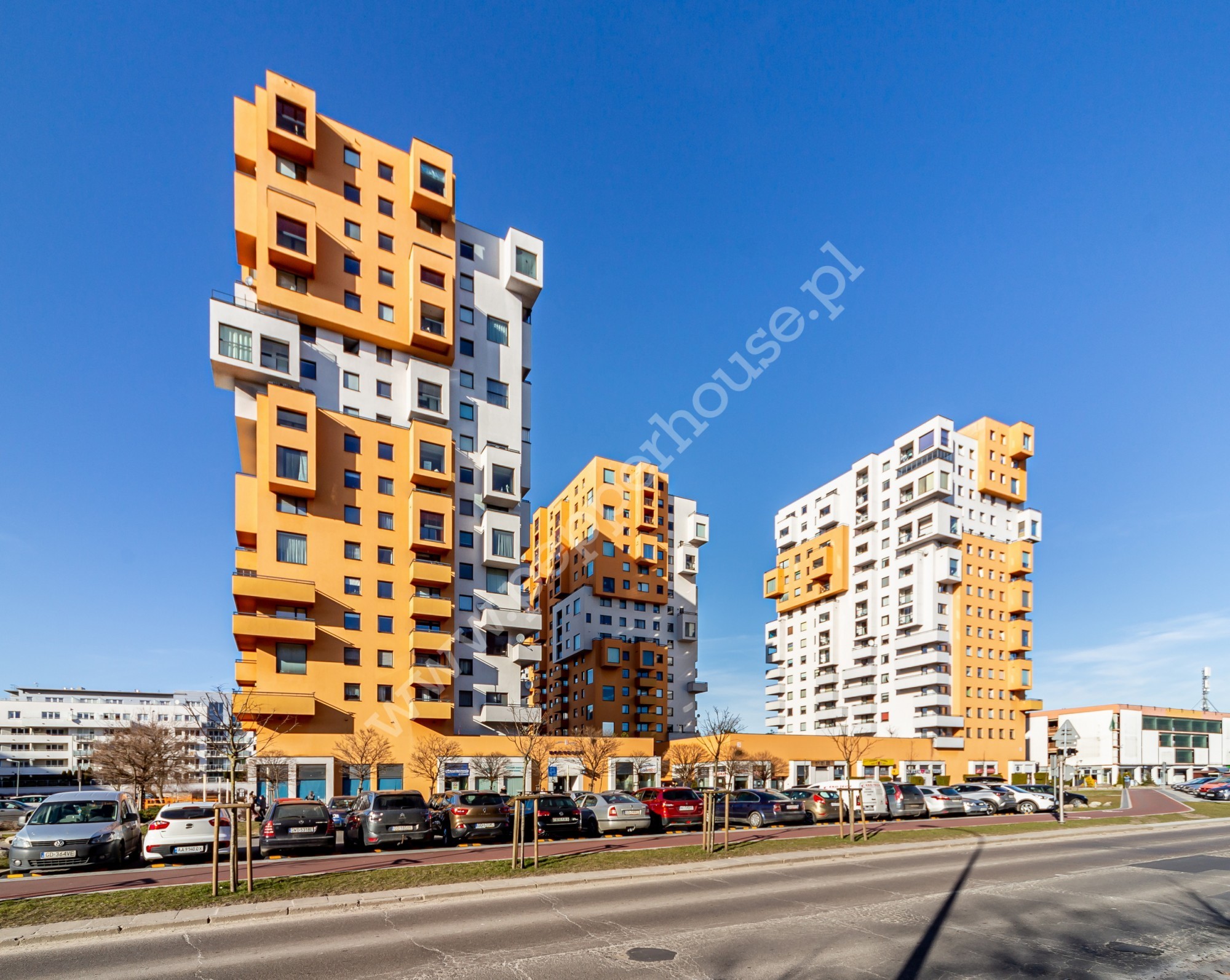 Oferowane mieszkanie to cześć inwestycji Horyzont, wybudowanej w 2006 roku przez dewelopera Ekolan. Jest to nieszablonowa, a przez to wyróżniająca się w okolicy konstrukcja przyciągająca wzrok z daleka. Teren wokół budynków jest ogrodzony i monitorowany. Dodatkowo o bezpieczeństwo dba całodobowa ochrona. Każdy budynek posiada indywidualną portiernię. Pomiędzy budynkami znajdziemy wewnętrzne patio do użytku wyłącznie mieszkańców. Nieopodal budynku znajdziemy parking z wieloma miejscami ogólnodostępnymi. Do mieszkania przynależy komórka lokatorska (2,3 m2) znajdująca się na tym samym piętrze co mieszkanie oraz miejsce w hali garażowej (dodatkowo płatne 50000 zł). W budynku funkcjonuje także wózkarnia/rowerownia.