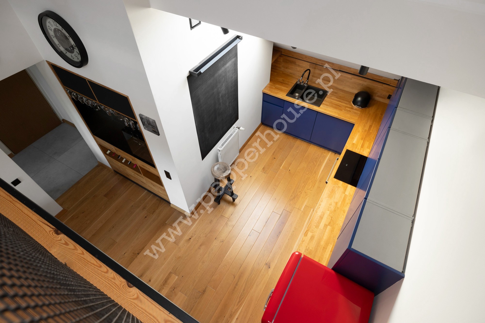 Dwupoziomowy charakter mieszkania nadaje wnętrzu wyjątkowy, loftowy klimat oraz poczucie przestrzeni. Dzięki dodatkowej powierzchni po podłodze mieszkanie jest znacznie bardziej funkcjonalne, niż wskazuje jego metraż użytkowy.