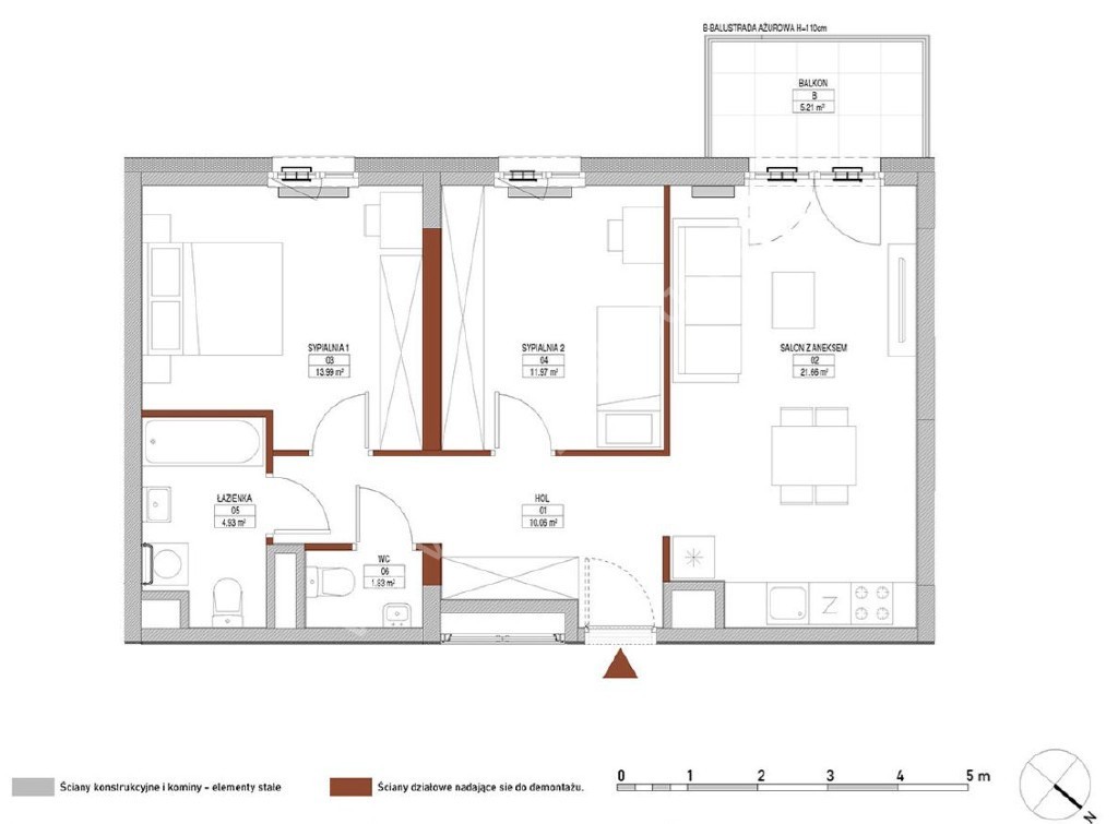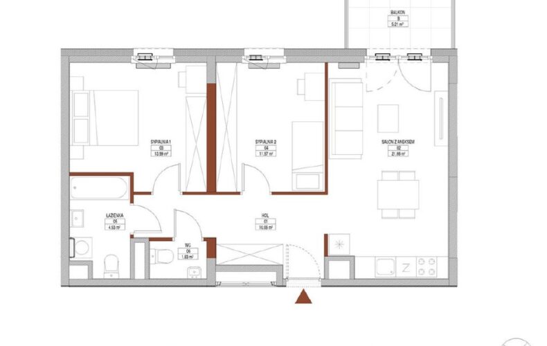 – pokoju z aneksem kuchennym z wyjściem na słoneczny balkon,