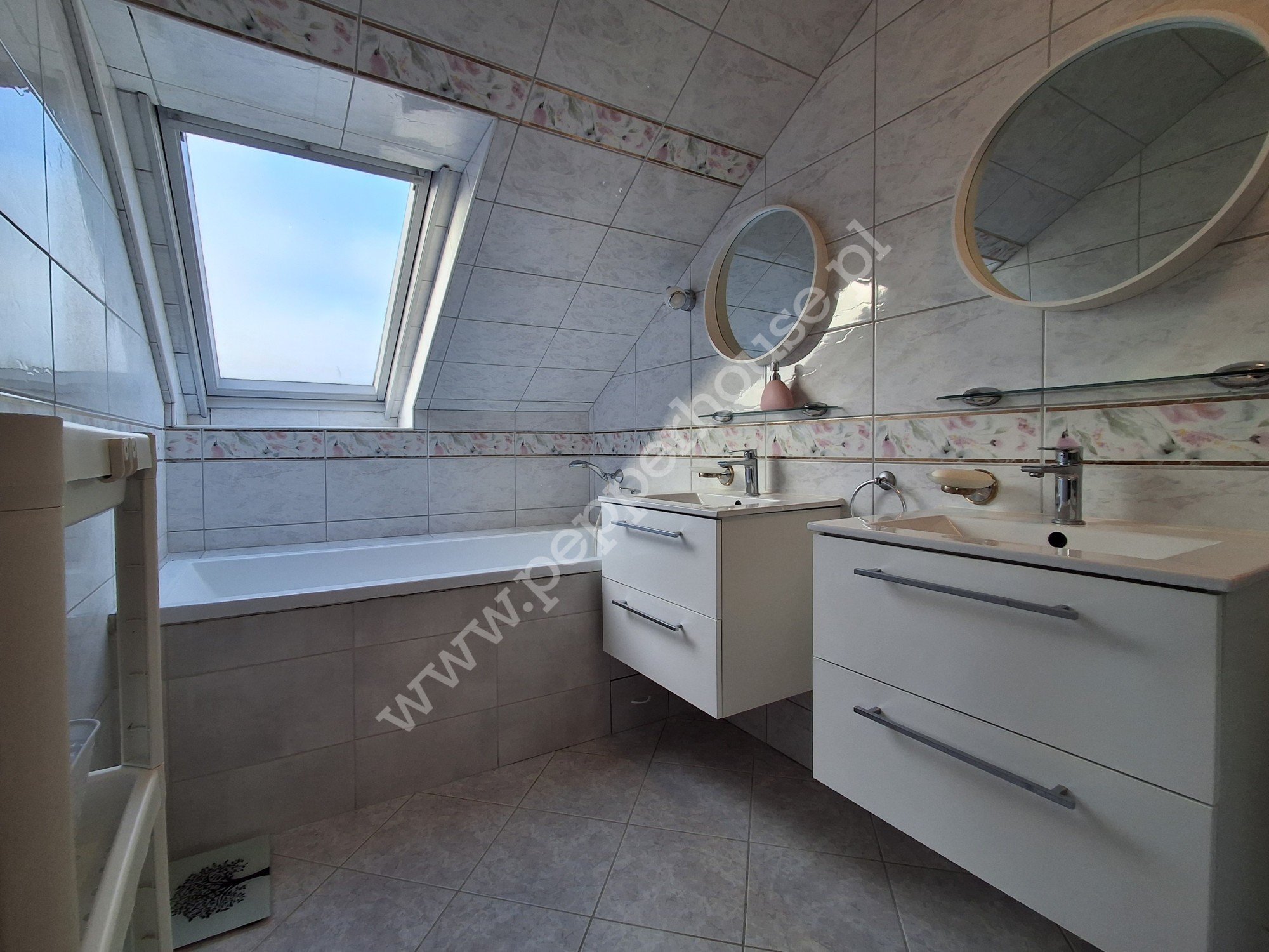 - łazienka ok. 6 m² z wanną i dwiema umywalkami,