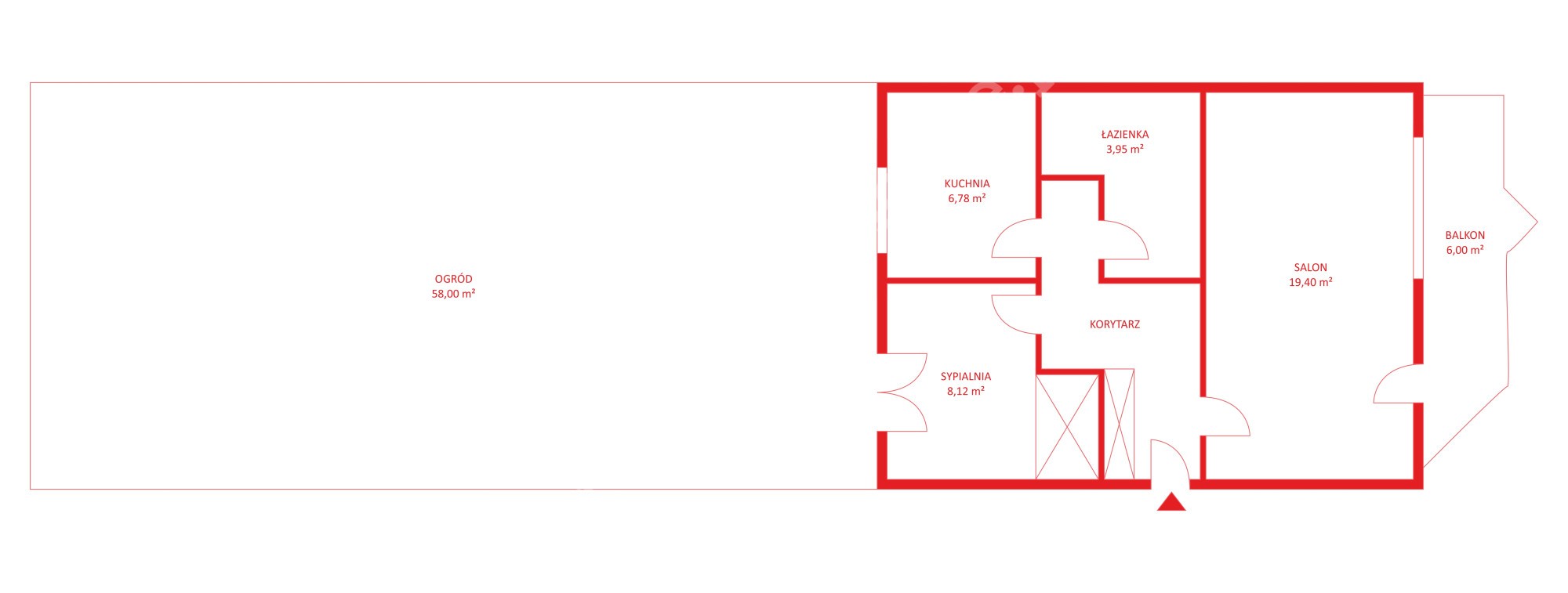 – sypialni (8,7 m2) z wyjściem na ogród ( 58 m2)