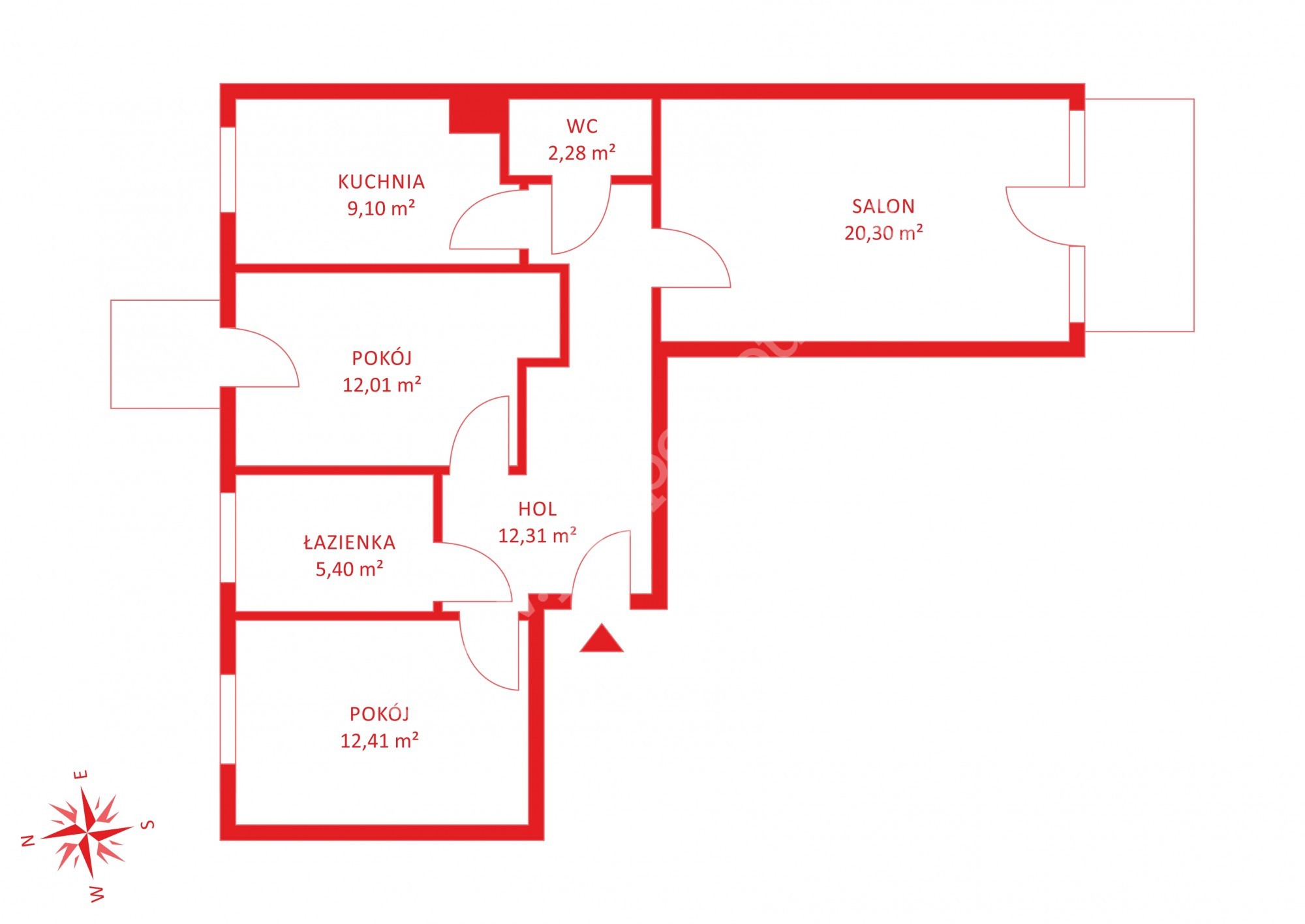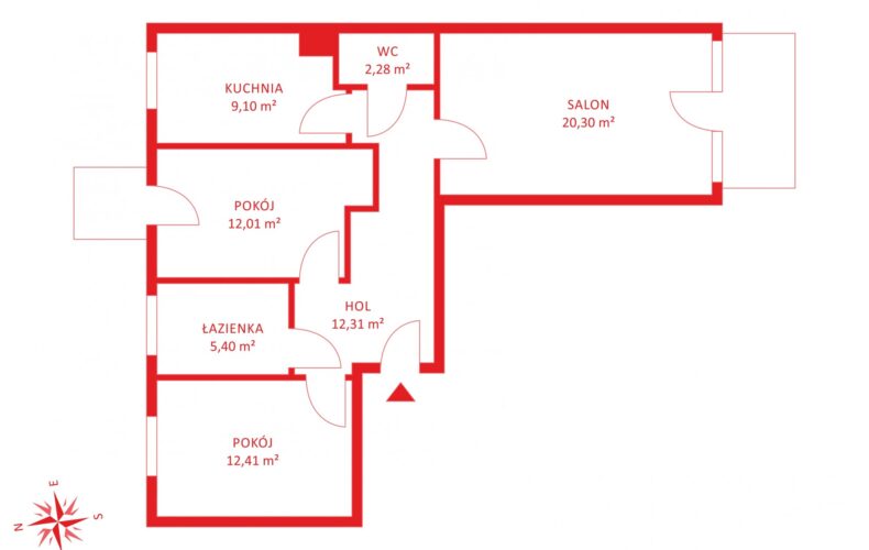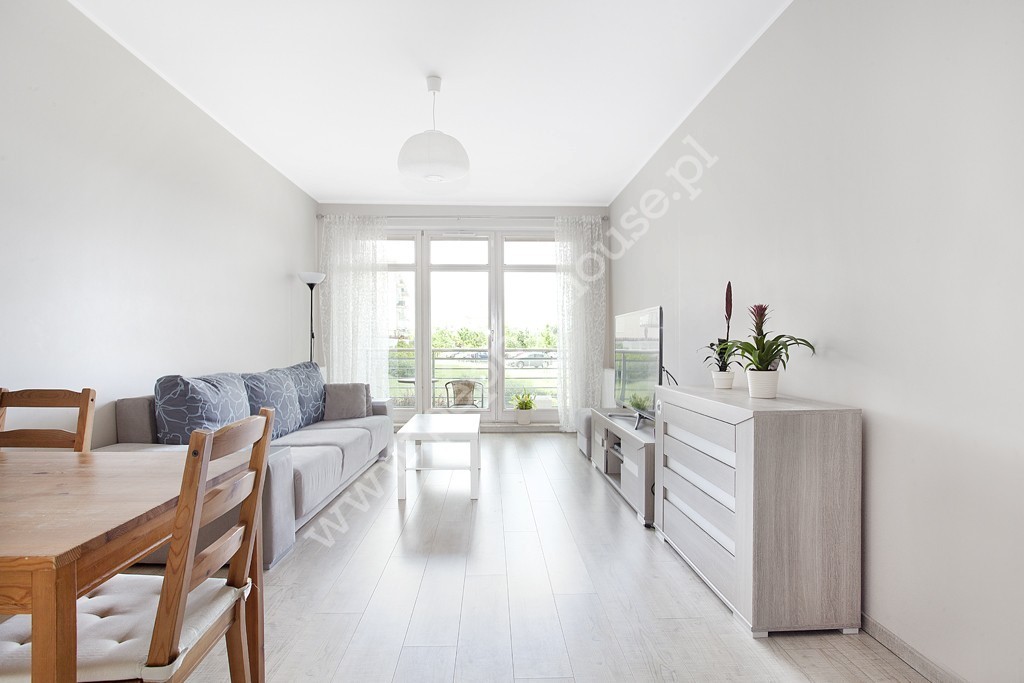 Lokal składa się z salonu (20,30 m2) z wyjściem na balkon i widokiem na tereny zielone, sypialni (12,41 m2), drugiej sypialni (12,01 m2) z wyjściem na drugi balkon, kuchni (9,10 m2), łazienki (5,40 m2), WC (2,28 m2) oraz holu (12,31 m2). Mieszkanie jest bardzo przestronne i ma funkcjonalny układ pomieszczeń. Salon znajduje się od strony południowej dlatego jest jasny i słoneczny.