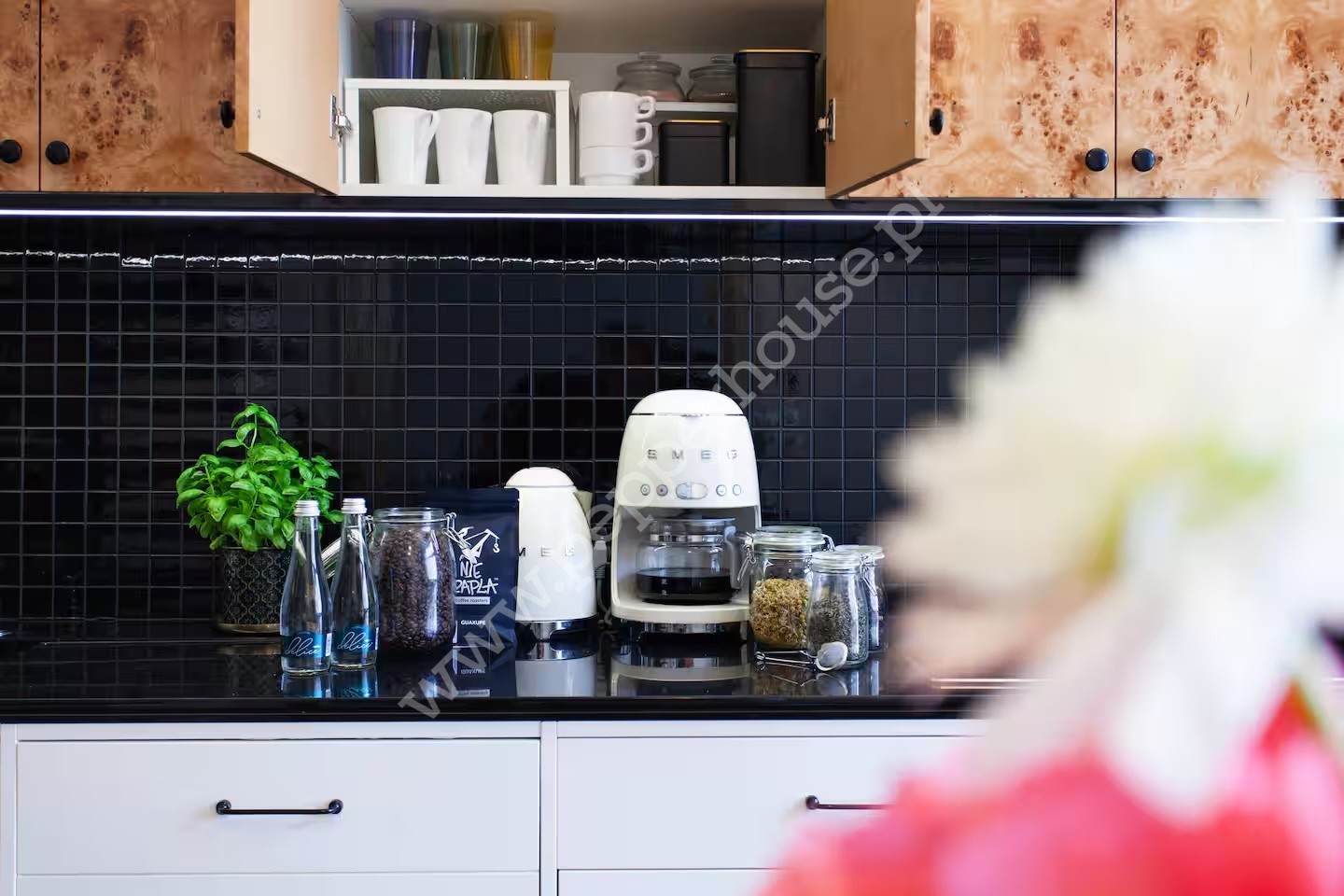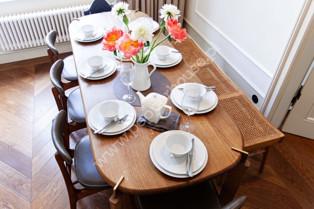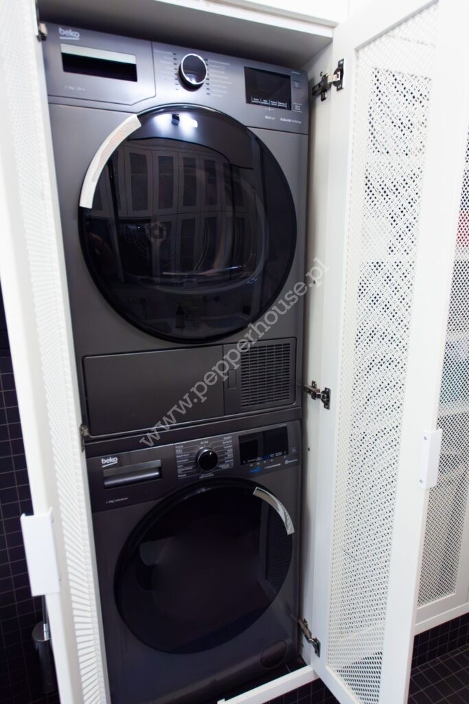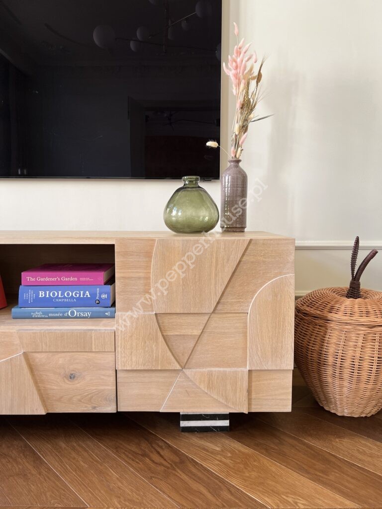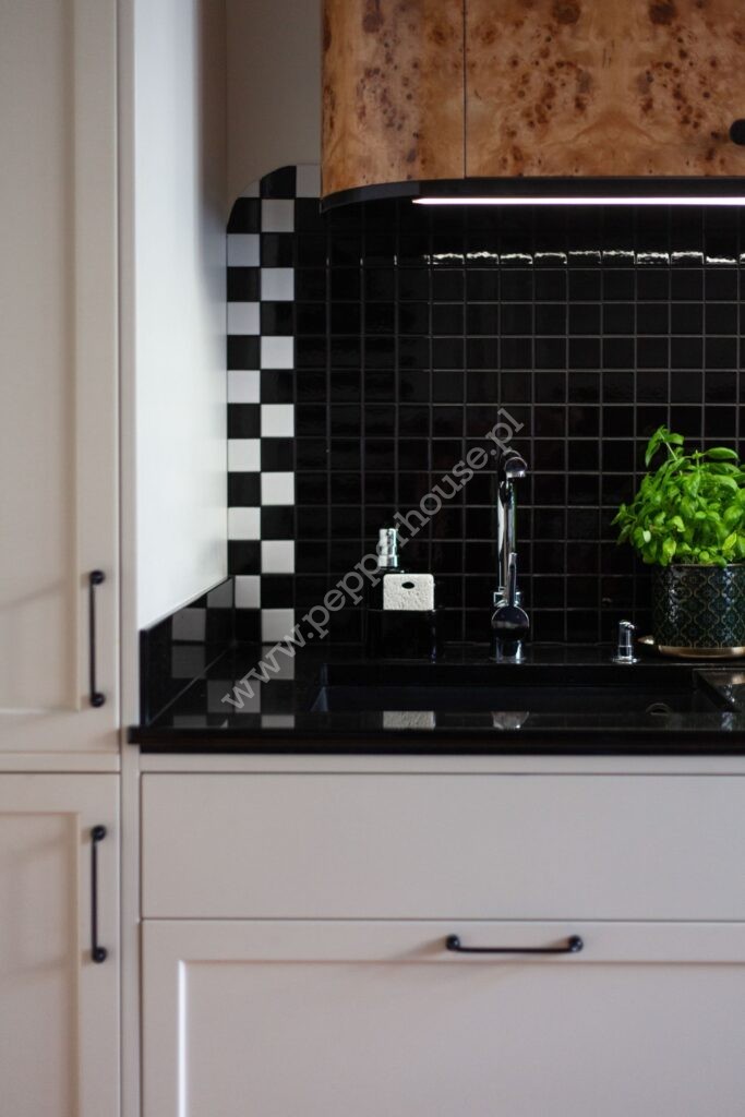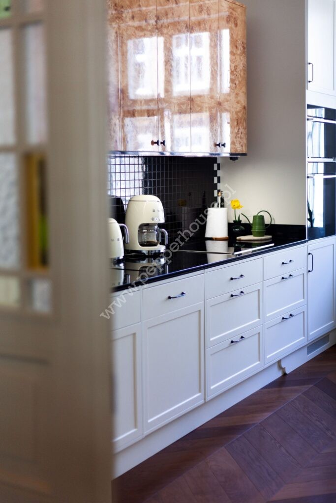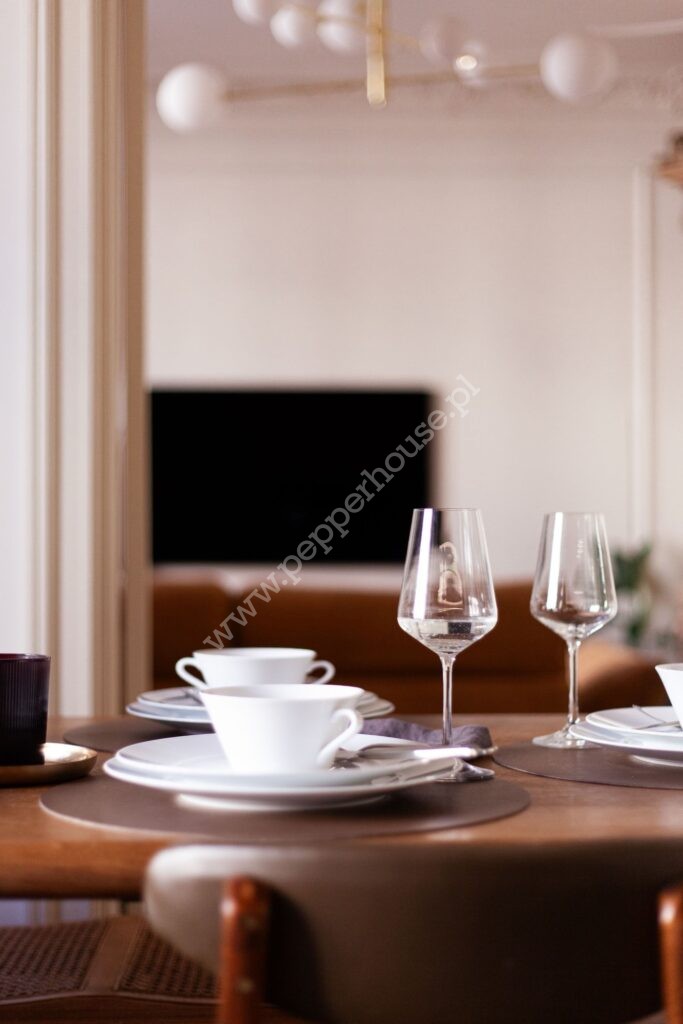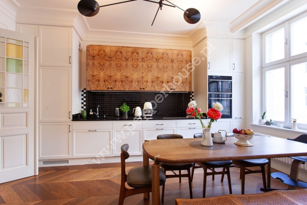 • Kuchnia z jadalnią (17 m2) została zaprojektowana jako spójna, elegancka przestrzeń. Pomieszczenie zostało w pełni wyposażona, z meblami wykonanymi na wymiar, w tym stołem i komodą zaprojektowanymi specjalnie do tego wnętrza. To miejsce idealne zarówno do codziennego funkcjonowania, jak i spotkań towarzyskich.