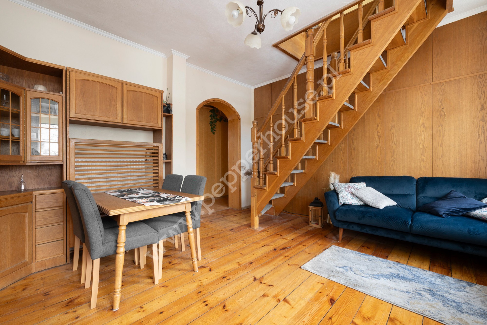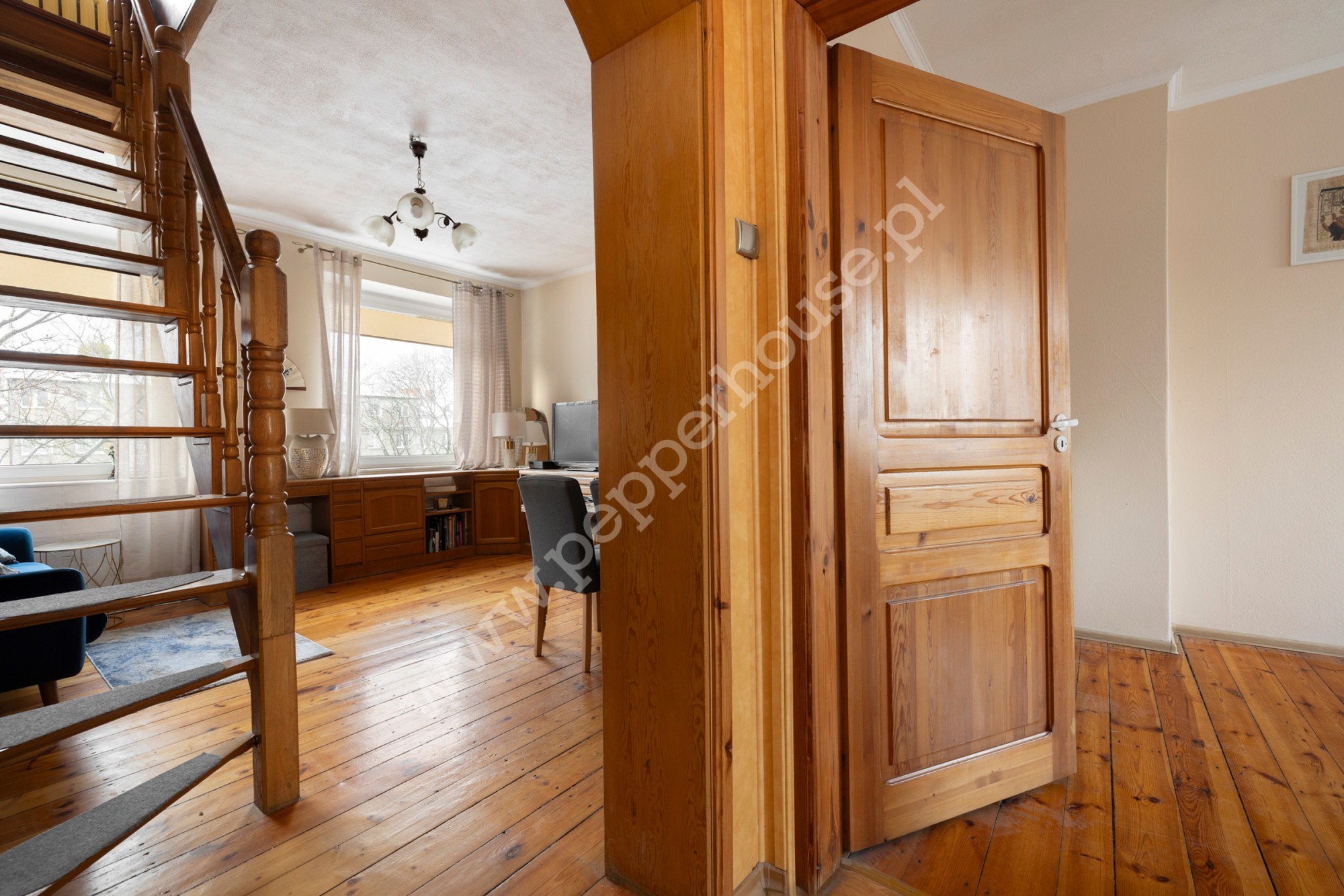 -stylowe, drewniane schody łączące oba poziomy, podkreślające charakter wnętrza.