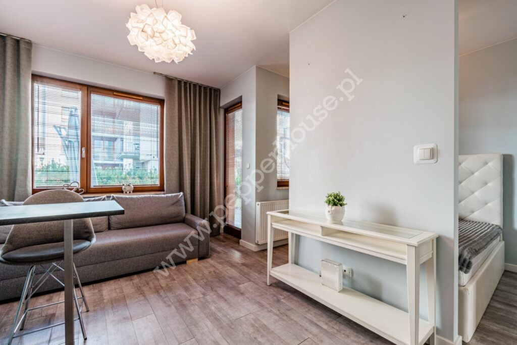 Mieszkanie mieści się na parterze.. Składa się z salonu z aneksem kuchennym, oddzielonej sypialni i łazienki. Łączna powierzchnia wynosi 27,5 m2. Z Salonu wyjście na piękny ogródek, w którym można odpocząć po ciężkim dniu. Wyposażenie widoczne na zdjęciach w cenie mieszkania. Miesięczne opłaty: 300 zł dla wynajmujących + czynsz administracyjny + opłaty eksploatacyjne.