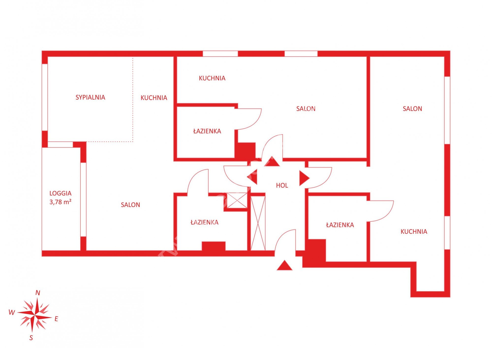 Na mieszkanie o powierzchni 91,75 m2 składają się 3 apartamenty typu studio oraz korytarz z szafą w zabudowie: