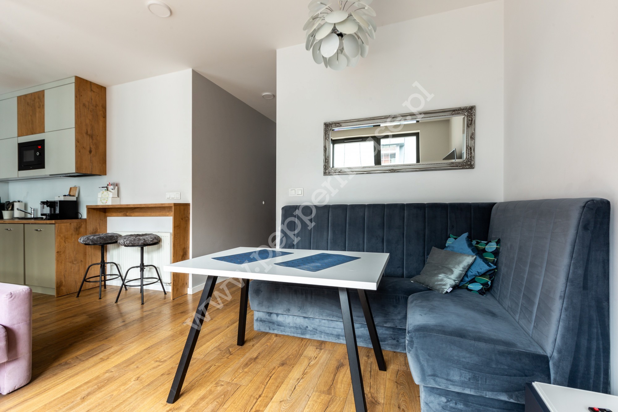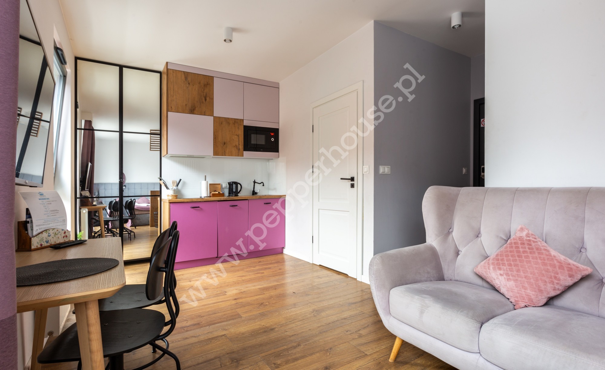 Mieszkanie zostało przystosowane pod wynajem krótkoterminowy, który w tej części miasta sprawdza się doskonale. Każdy z apartamentów został wykończony w nowoczesnym, wysokim standardzie z dbałością o szczegóły, na które zwracają uwagę najemcy, ale także i właściciele. Każdy z lokali posiada część sypialnianą, kuchenną oraz łazienkę z WC. Dodatkowo największy z lokali posiada wyjście na wyposażoną loggię, na której istnieje możliwość instalacji klimatyzacji oraz wydzieloną szklaną ścianą sypialnię. Kuchnie każdego z apartamentów wyposażone zostały w płytę indukcyjną, zmywarkę, mikrofalę oraz małe AGD. Poza tym do dyspozycji lokatorów są dwie pralki oraz szafy.