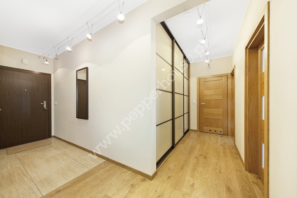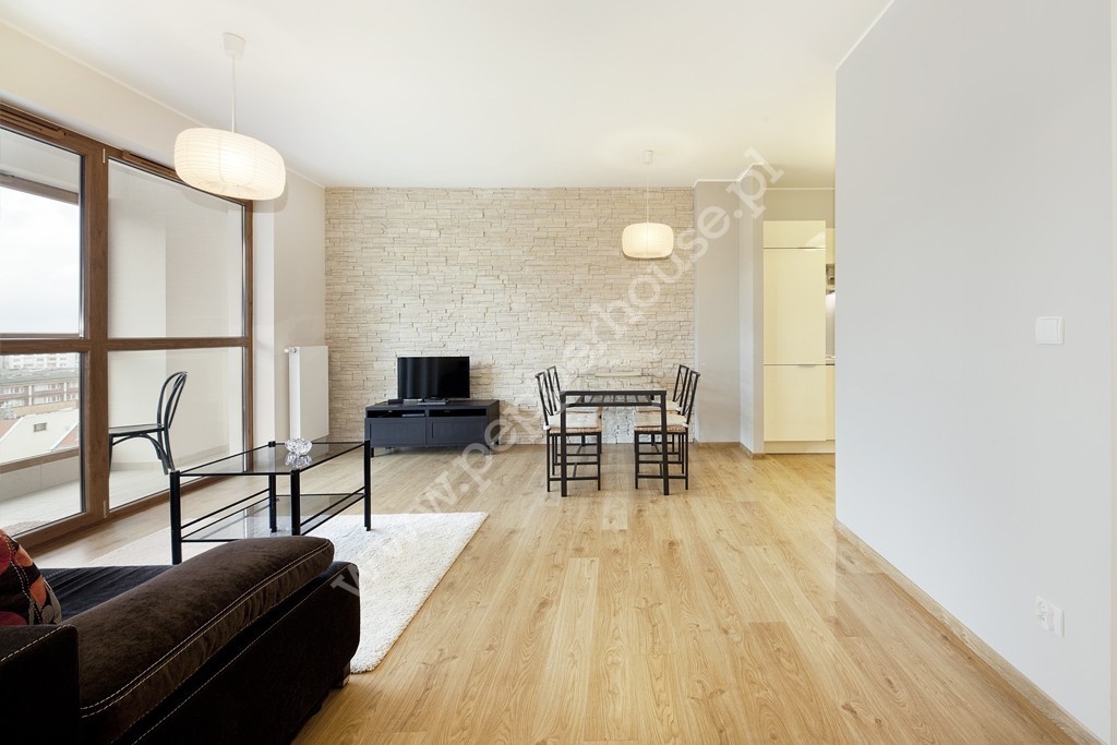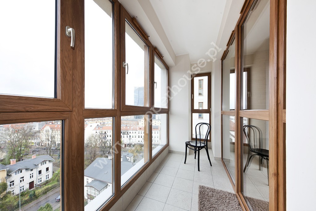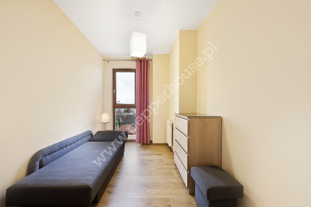 W salonie kanapa, stół z 4 krzesłami, telewizor z szafka tv. Balkon jest zabudowany z możliwością otwarcia okien. W sypialni mamy podwójne duże łóżko z pięknym widokiem na panoramę Gdańska, w drugim pokoju znajduje się kanapa z szafką nocną, komodą i również pięknym widokiem. Korytarz wyposażony w przestronną garderobę.