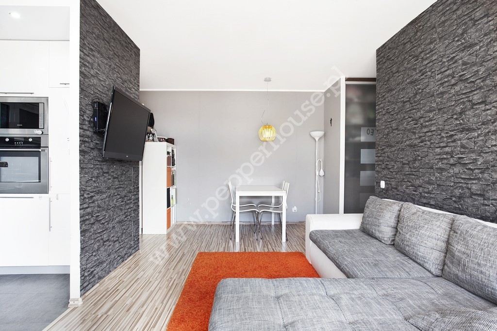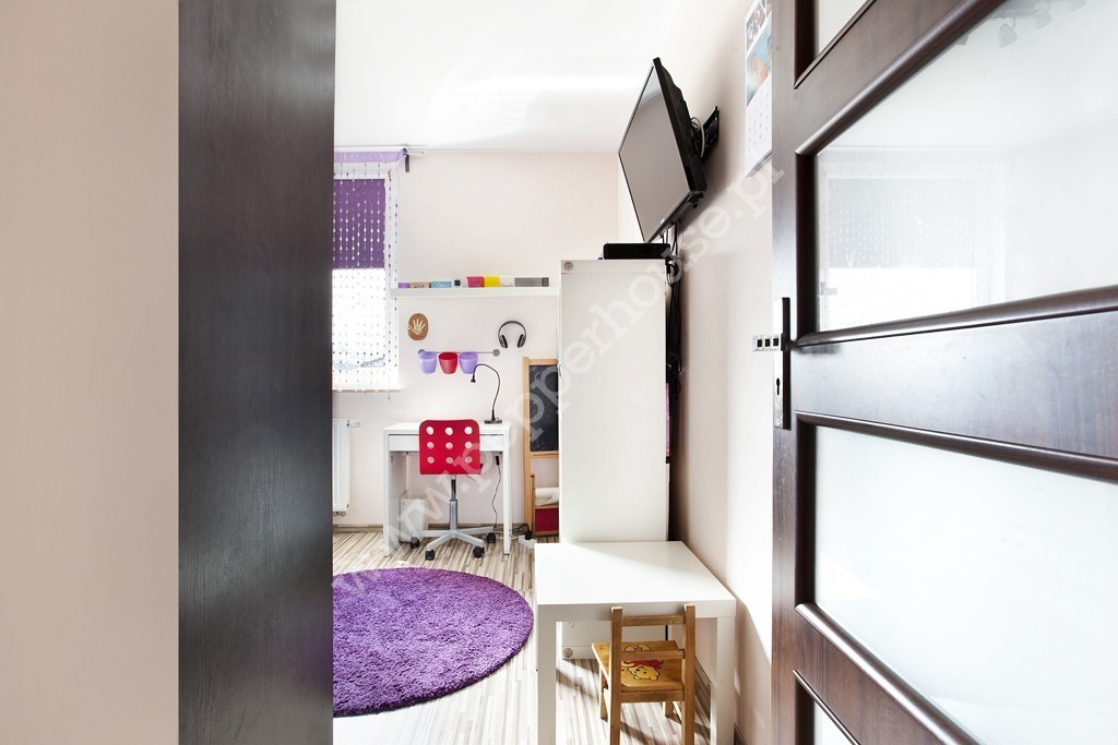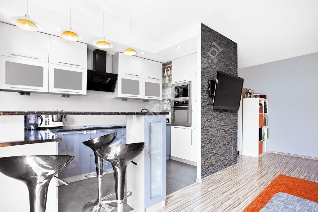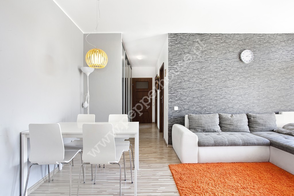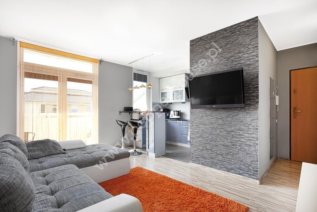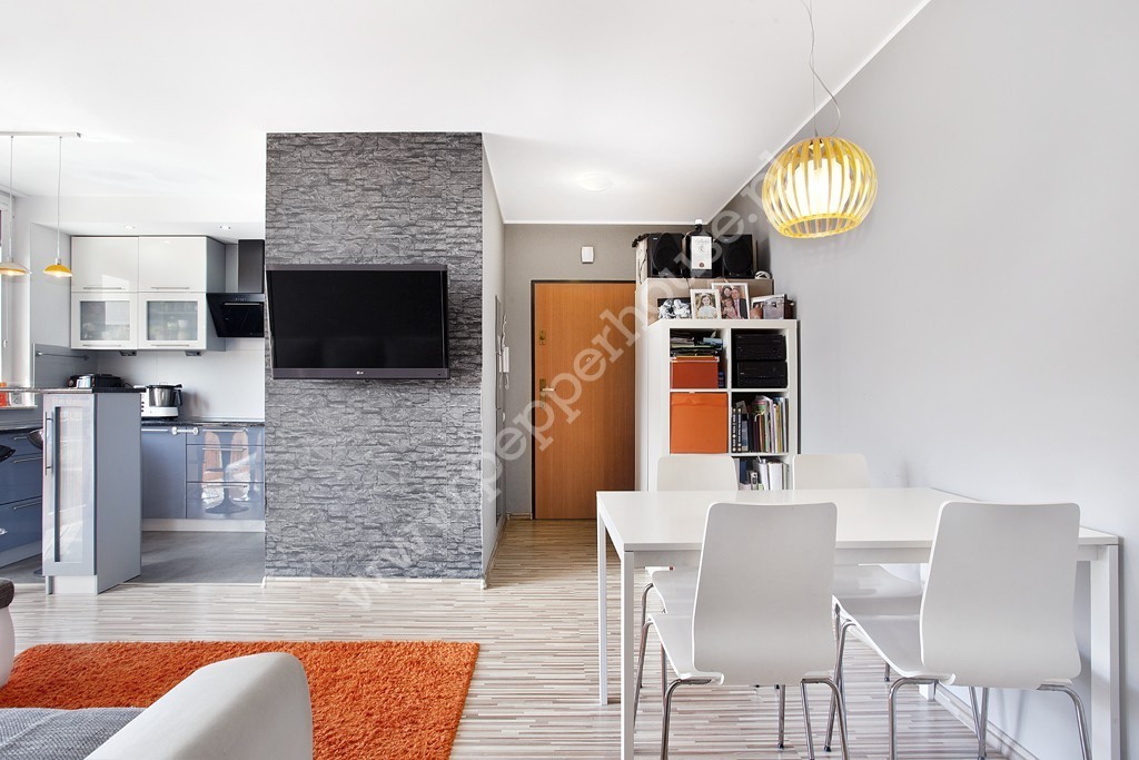 Lokal o powierzchni 57,4 m2 w dobrym standardzie, składa się z obszernego salonu z aneksem kuchennym (18,2 m2) i balkonem (4m2), dwóch sypialni (10,3m2 i 8,9m2), łazienki (4,6 m2), przedpokoju (15,4 m2). Mieszkanie posiada ekspozycję południowo-zachodnią, dzięki czemu jest jasne i słoneczne, co przekłada się na niskie koszty ogrzewania. Aneks kuchenny w pełni wyposażony w sprzęty AGD. W przedpokoju duża zabudowa.
