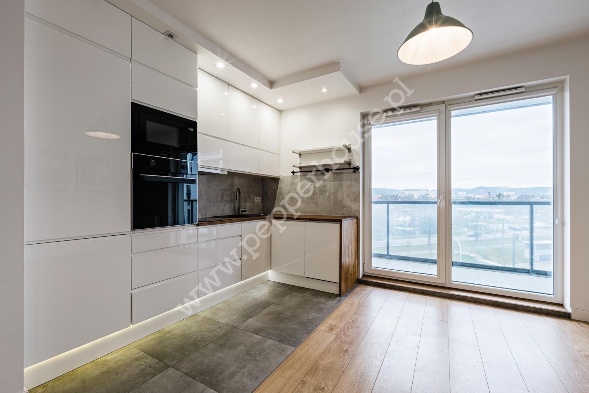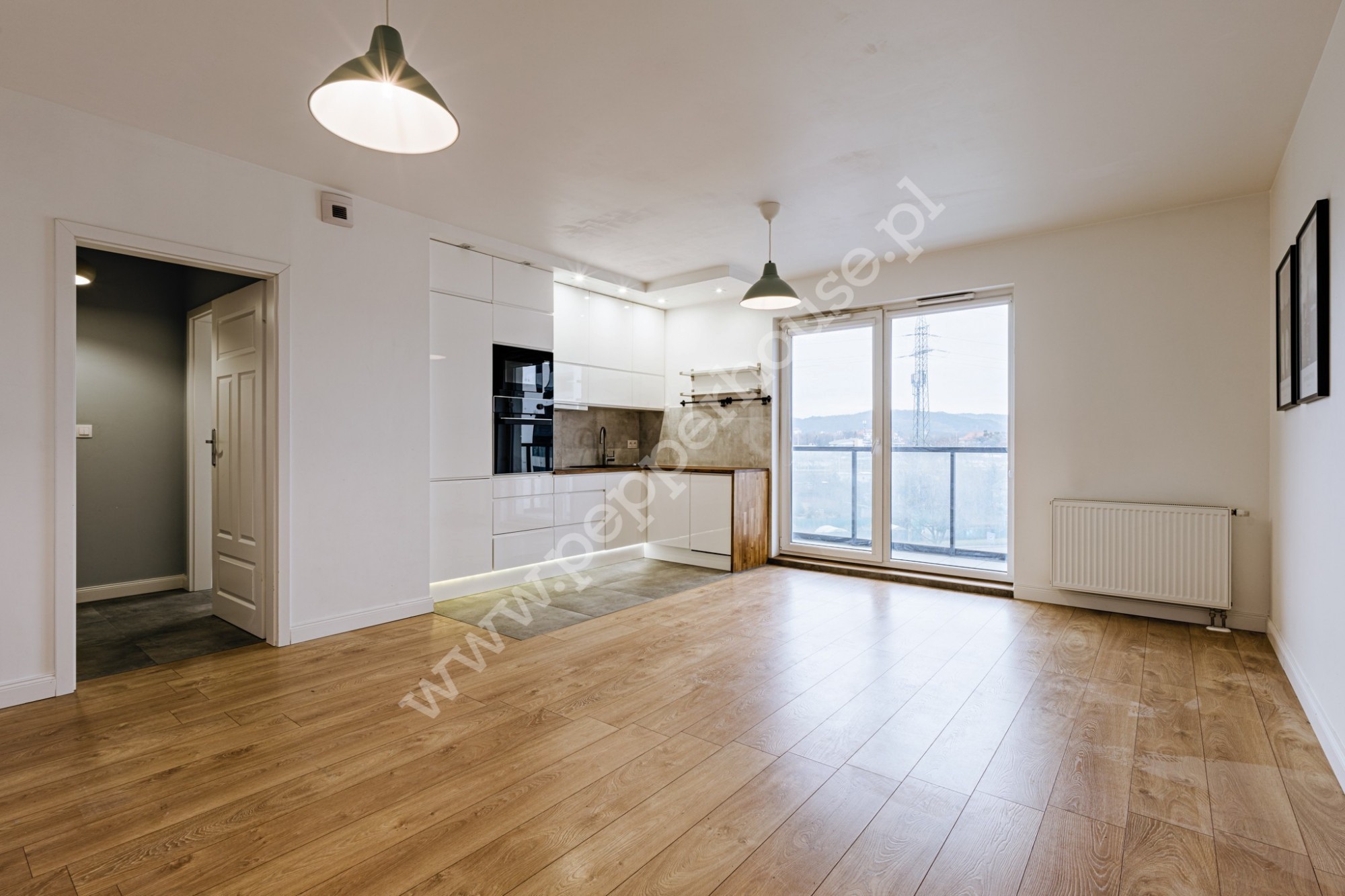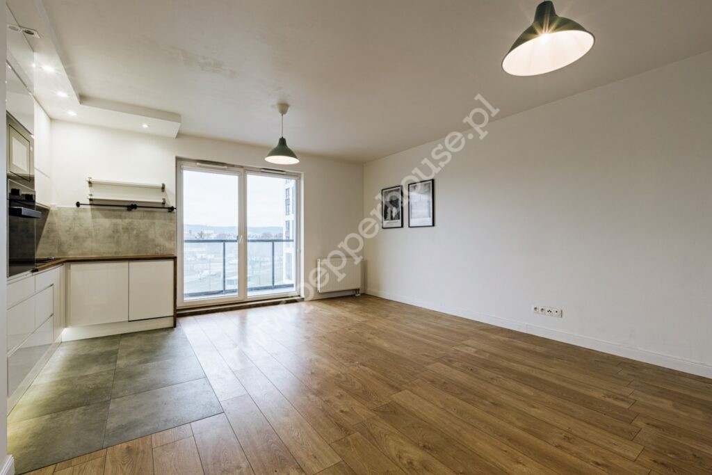 – salonu wraz z aneksem kuchennym i wyjściem na balkon,