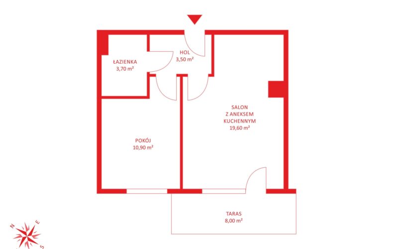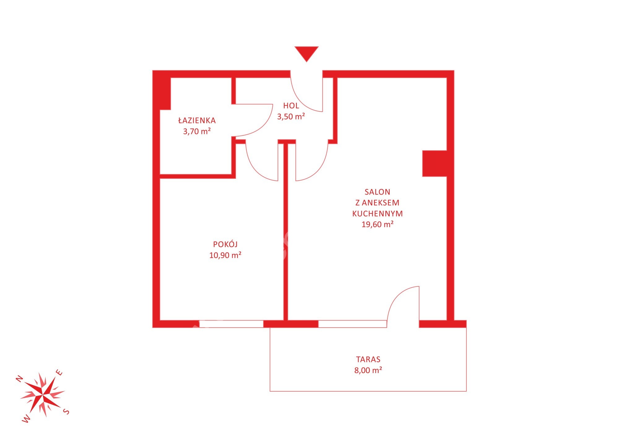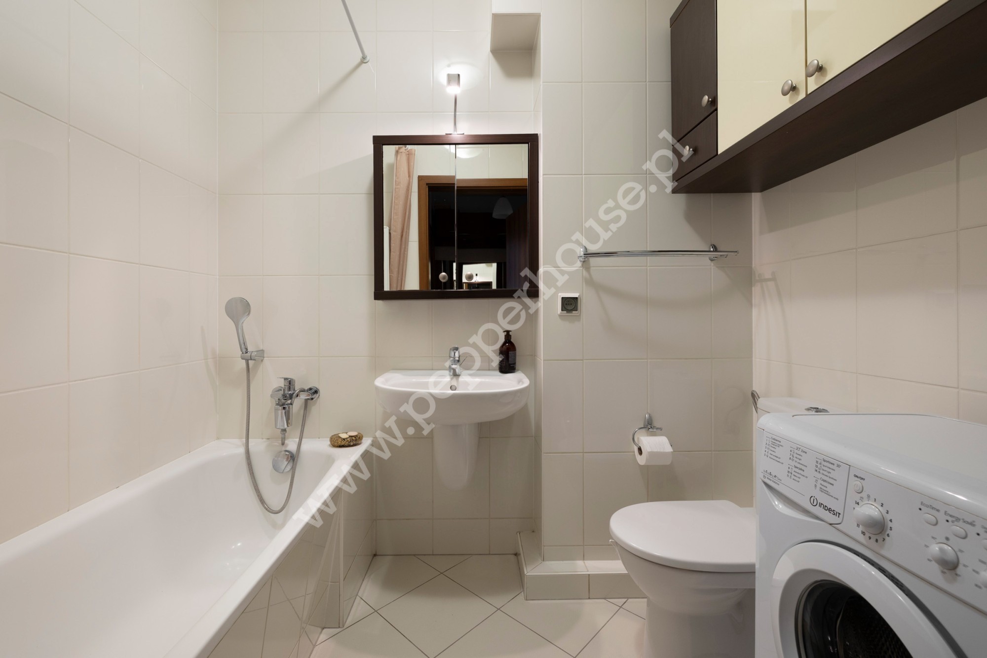 - Łazienka (3,7 m²) – z wanną, WC i miejscem na pralkę.