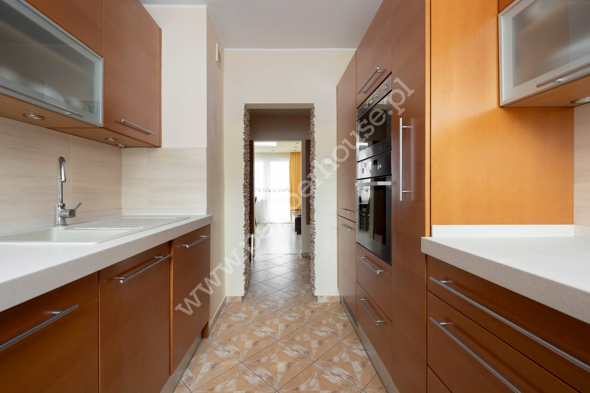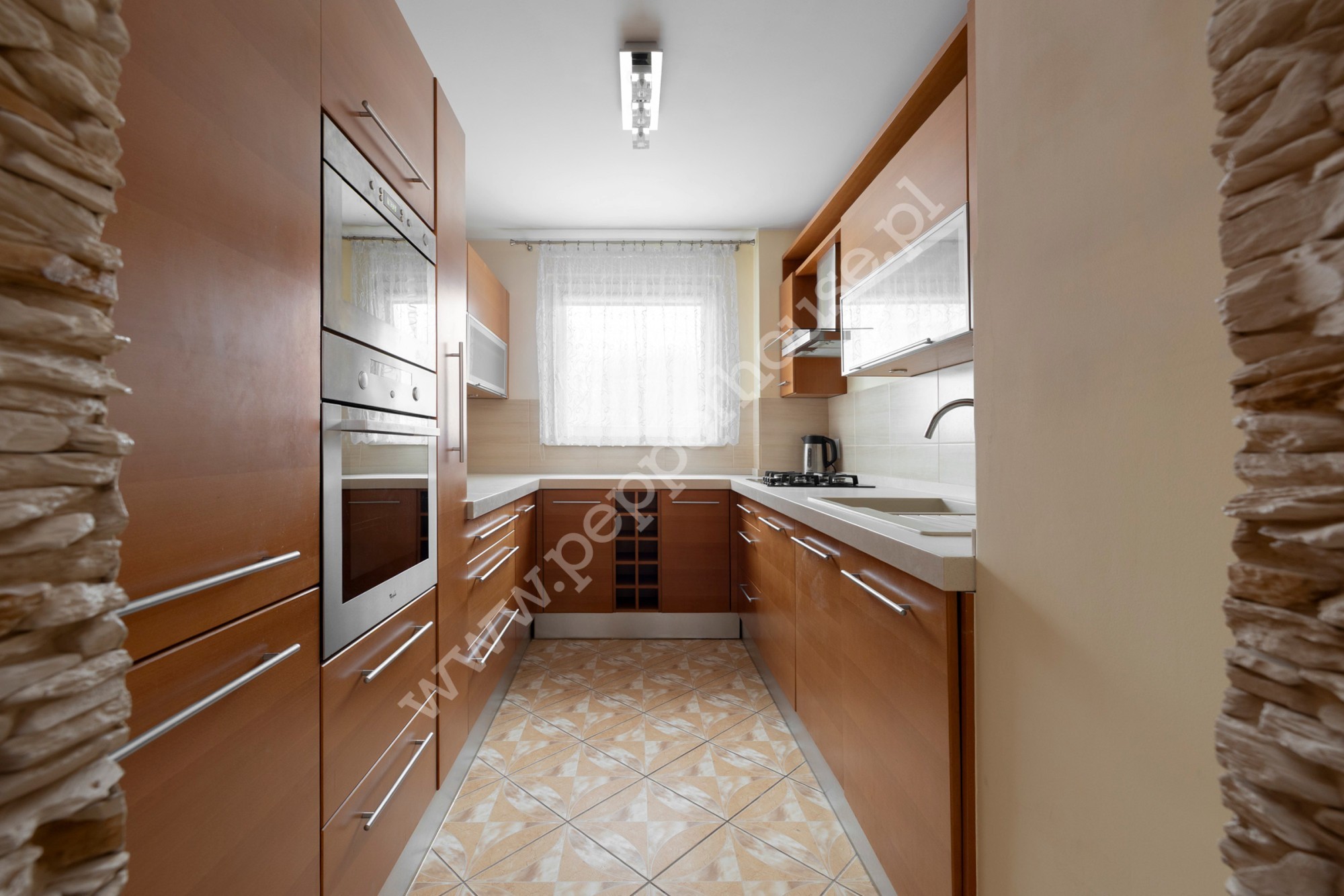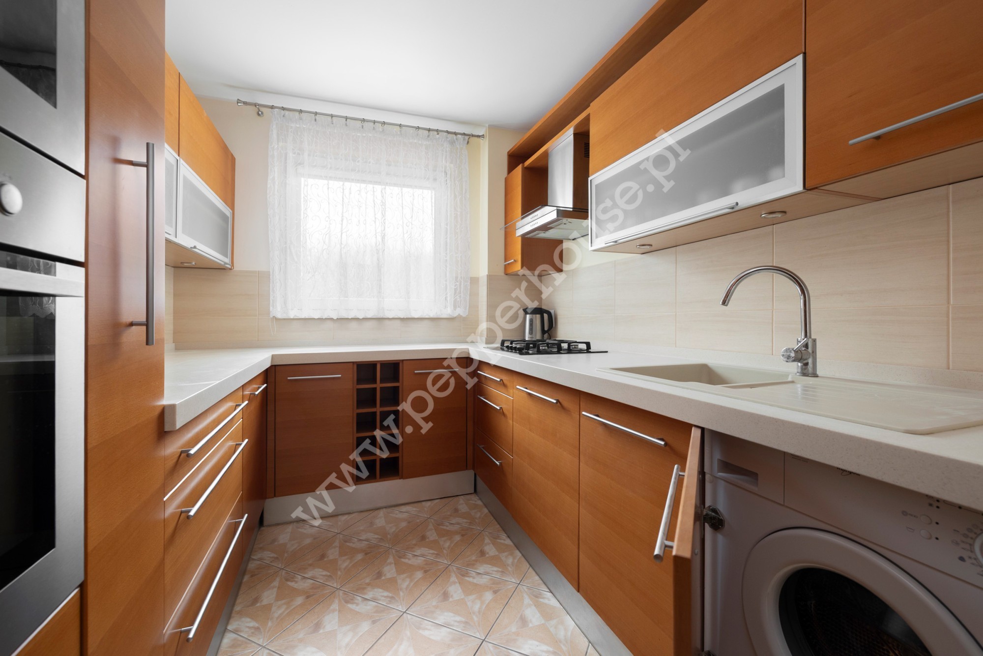 oddzielnej, w pełni wyposażonej kuchni z meblami fornirowanymi i AGD (piekarnik elektryczny, płyta gazowa, lodówka, duża zmywarka, pralka, mikrofalówka)