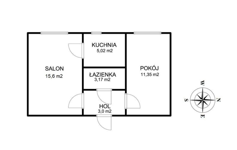 Sam lokal składa się z przestronnego salonu (15,6m2) z przejściem do oddzielnej kuchni z dużym oknem (powierzchnia 5,02m2), oddzielnej sypialni (11,35) oraz łazienki (3,17m2).