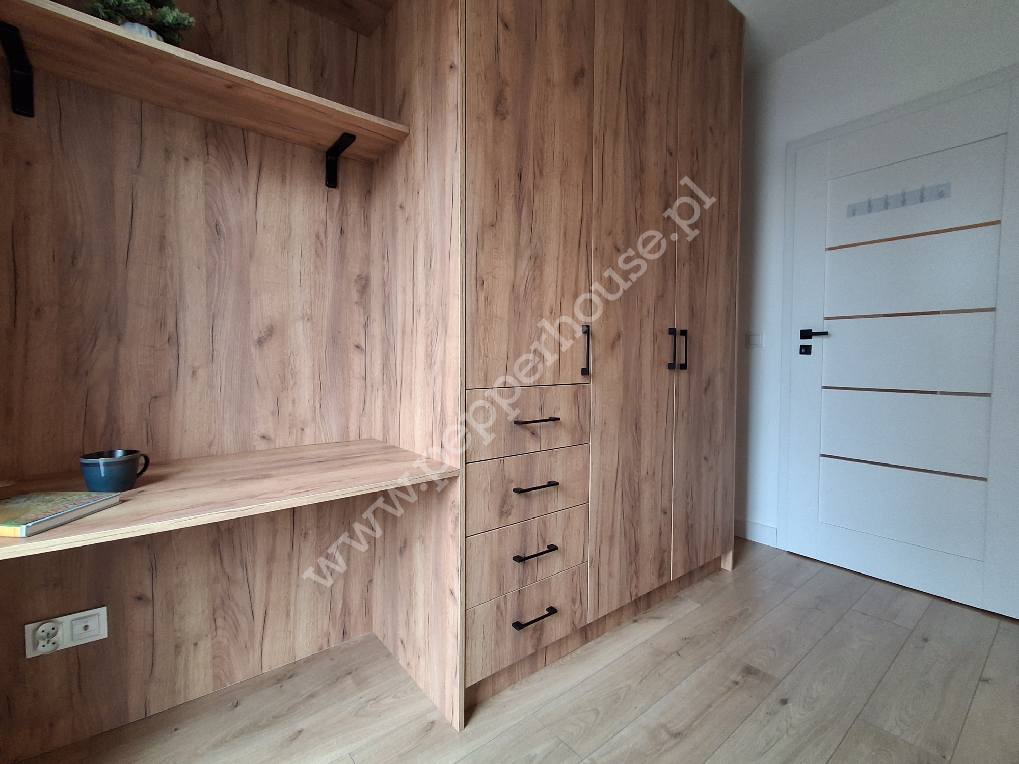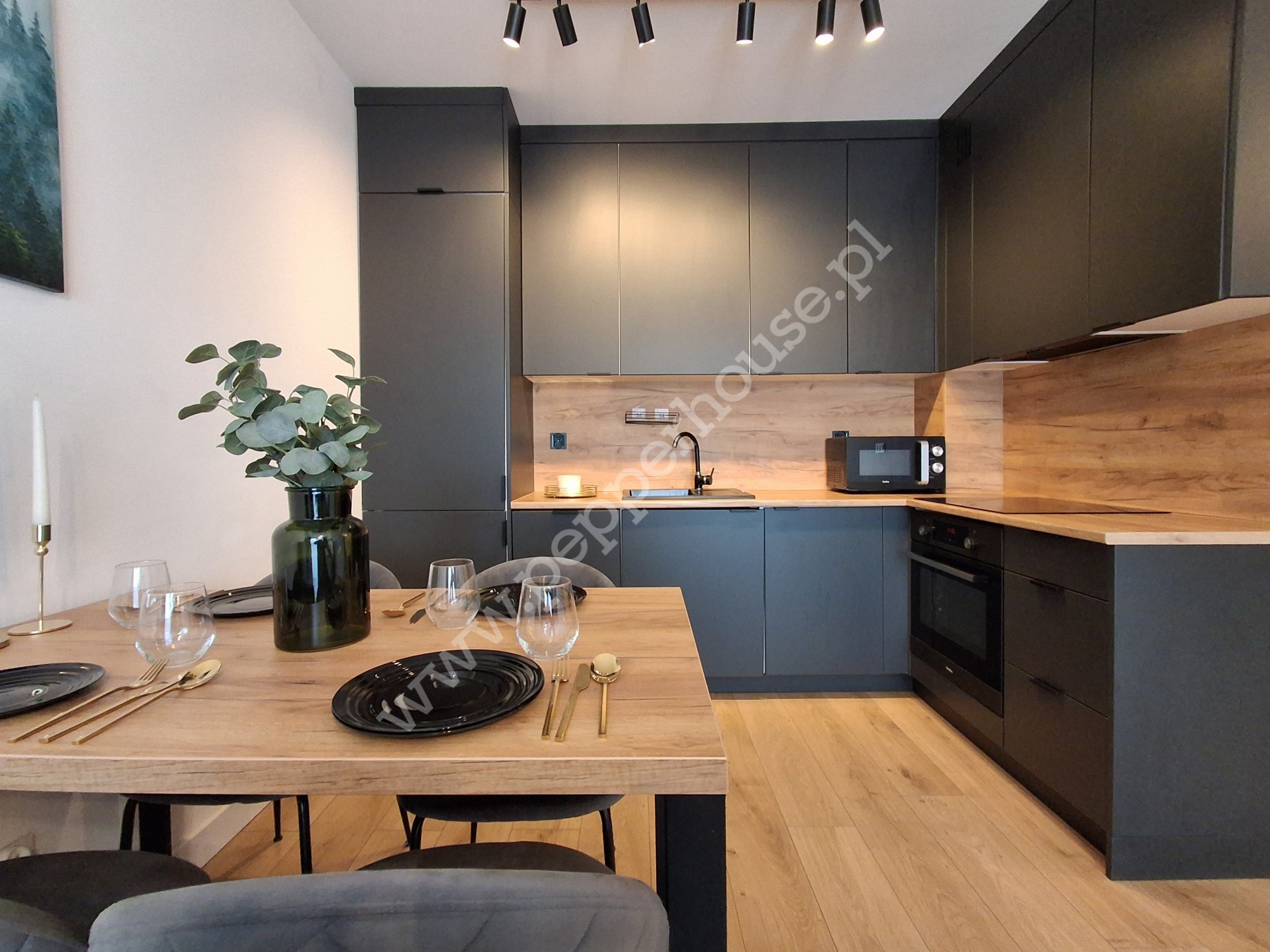 - zabudowę kuchenną + sprzęt AGD: zmywarka, lodówka, piekarnik, płyta indukcyjna, mikrofalówka, czajnik