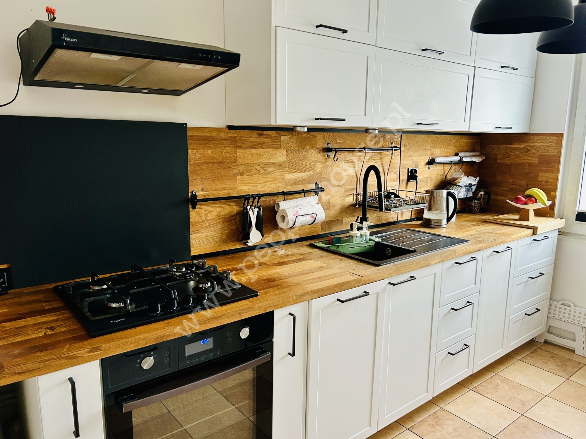 Oddzielna kuchnia z oknem (6,5 m²) została wykonana na wymiar około 3 lata temu. Wyposażona jest w nowoczesne AGD w zabudowie, liczne systemy cargo oraz przemyślane rozwiązania do przechowywania. Na szczególną uwagę zasługują lite dębowe blaty o grubości 38 mm oraz okładzina ścienna z dębu 18 mm, które nadają wnętrzu elegancki i ponadczasowy charakter.