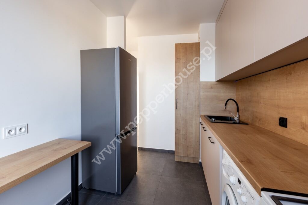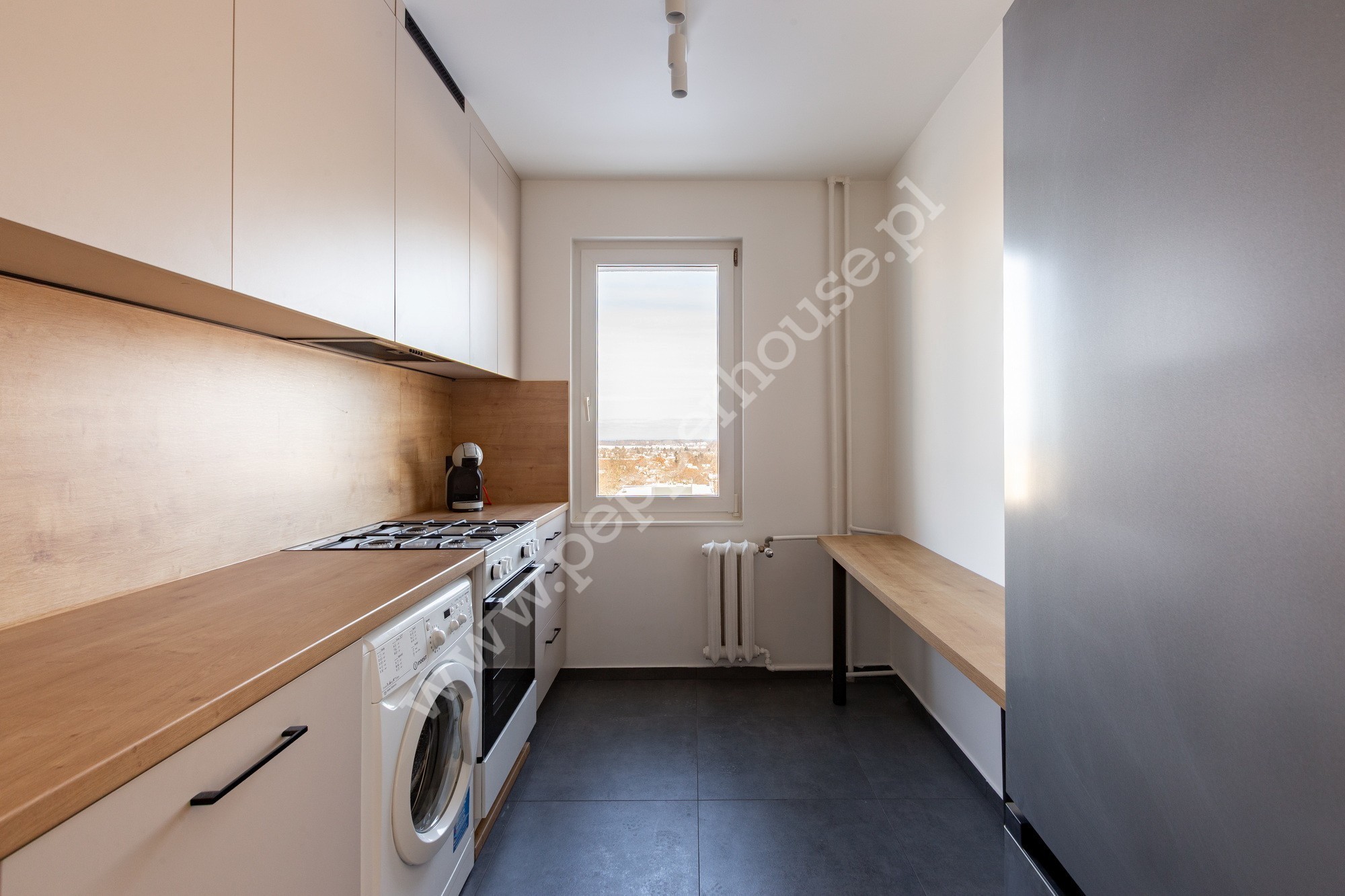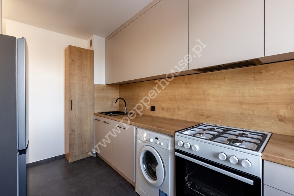 • Kuchnia: oddzielna, jasna, zabudowa na wymiar (lodówka, zmywarka 60 cm, okap, kuchenka gazowa, pralka)