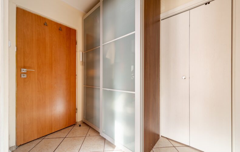 – przedpokój z pojemna szafą ze szklanymi drzwiami