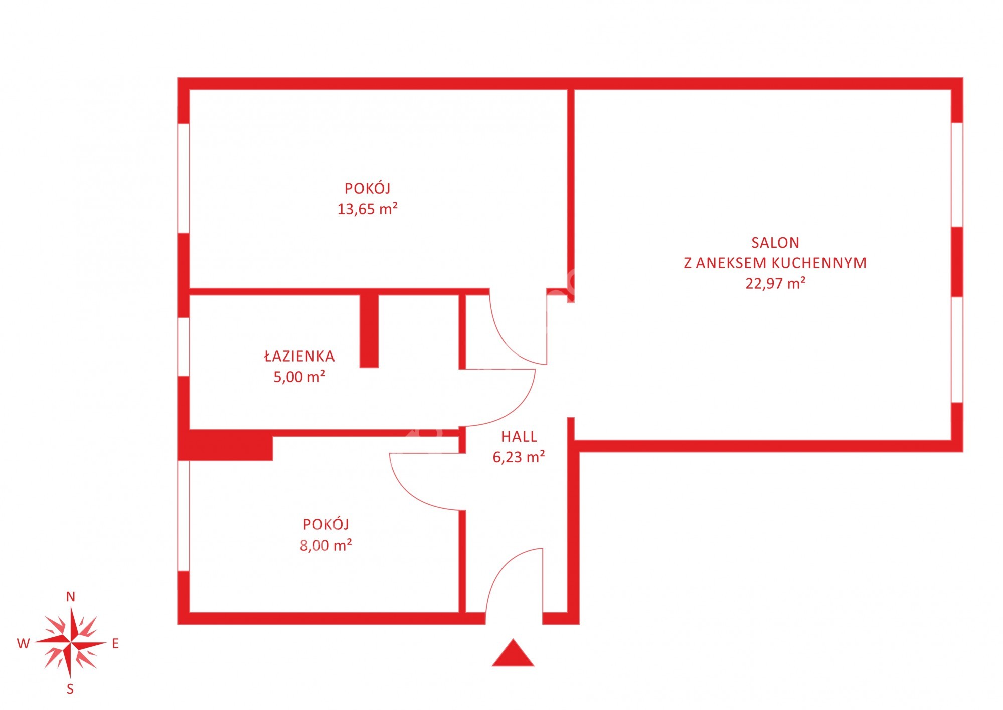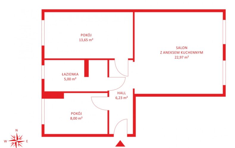 Lokal składa się z przestronnego salonu z aneksem kuchennym (22.87 m2), sypialni (13,65 m2), drugiej sypialni (8m2), łazienki (5 m2),i przedpokoju (6,23m2)