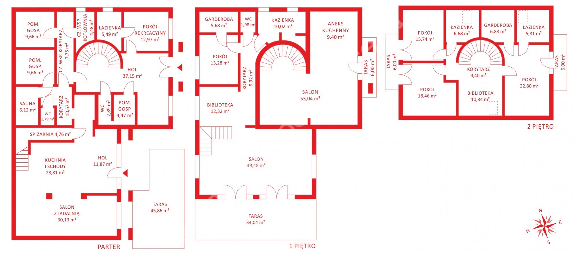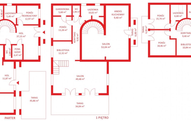 W parterowej części domu znajduje się hol z pomieszczeniami gospodarczymi oraz gabinet z łazienką. W apartamencie znajdują się piękne kręcone schody prowadzą przez wszystkie kondygnacje aż do poddasza. Na poziomie I pietra przepiękny, dobrze doświetlony salon połączony z kuchnią i jadalnią, z wyjściem na mały taras. Na II piętrze znajdują się trzy sypialnie, w tym jedna z łazienką i garderobą, dwie pozostałe ze wspólną łazienką. Obie łazienki posiadają okna. Na piętrze znajduje się też wspólna strefa relaksu.