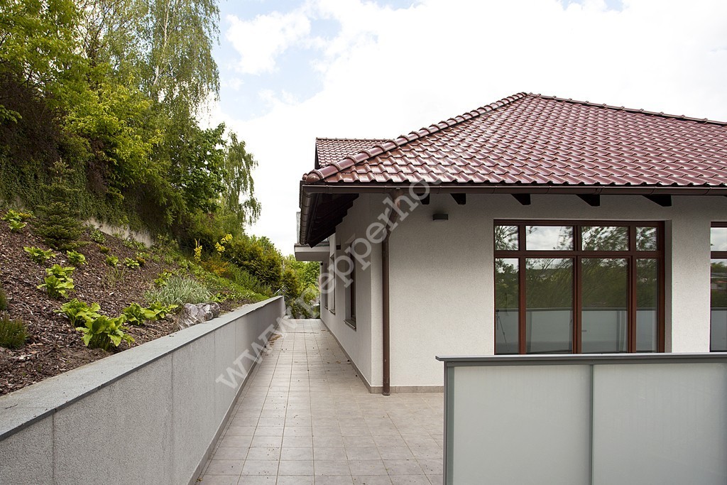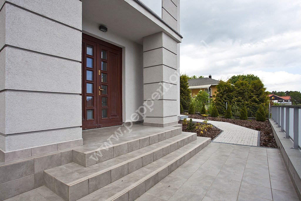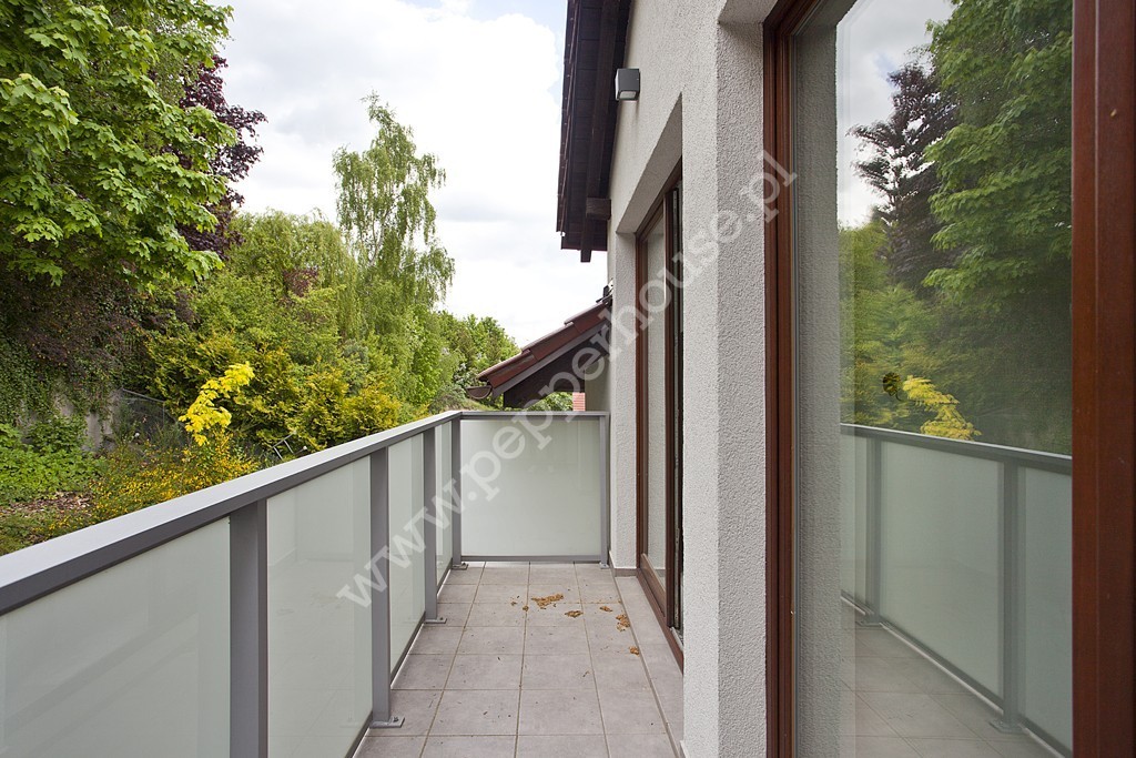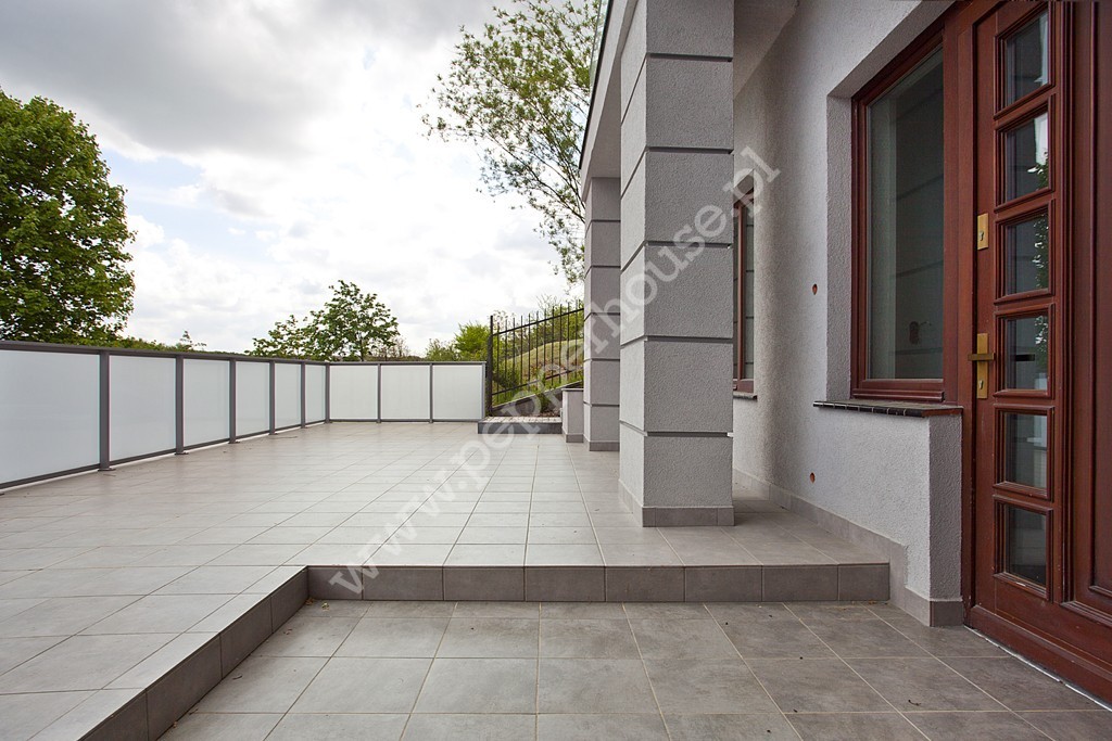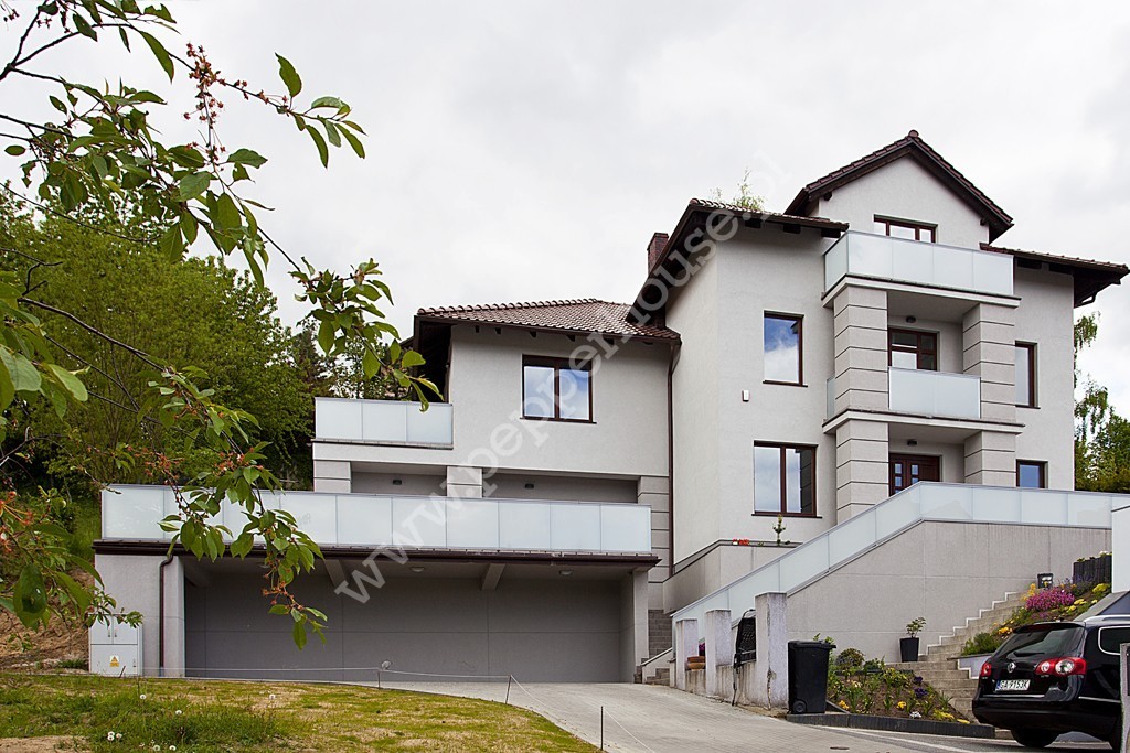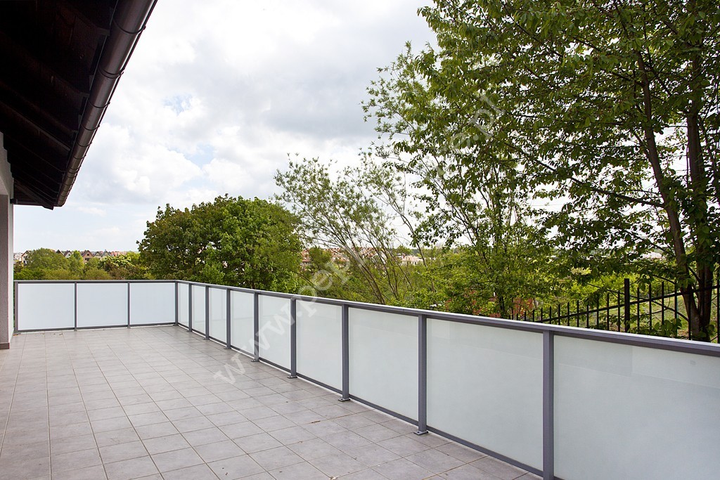 tarasy – pokryte płytkami mrozoodpornymi, balustrady z aluminium lakierowanego proszkowo, szkło bezpieczne 33.1 (6,4mm) mleczne