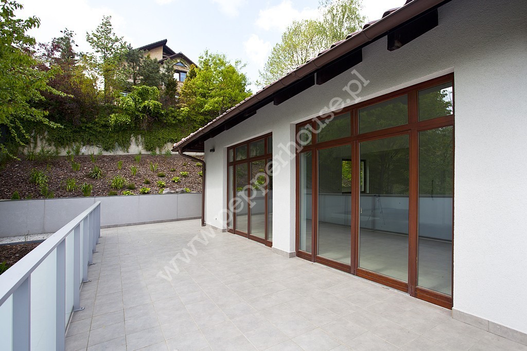 W parterowej części domu znajdują się przeszklony hol oraz przestrzeń do dalszej aranżacji. Na parterze domu toaleta, pomieszczenia gospodarcze i rekreacyjne. Do parterowej części domu należy taras o powierzchni 46 m2, z pięknym widokiem. Piętro domu to mocno doświetlona duża przestrzeń do aranżacji z ogromnymi oknami do podłogi, otwarta aż do zwieńczenia dachu (ponad 6 m wysokości), z wyjściem na piękny, widokowy taras od strony południowej (powierzchnia 34 m2). Oba tarasy idealne do zabaw dla dzieci, relaksu, ćwiczeń Na piętrze znajduje się też sypialnia z wydzieloną garderobą. Obok niej jasna łazienka. Osobna toaleta obok. Obie kondygnacje posiadają przygotowaną infrastrukturę niezbędną w kuchni oraz salonie.
