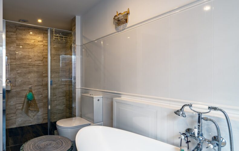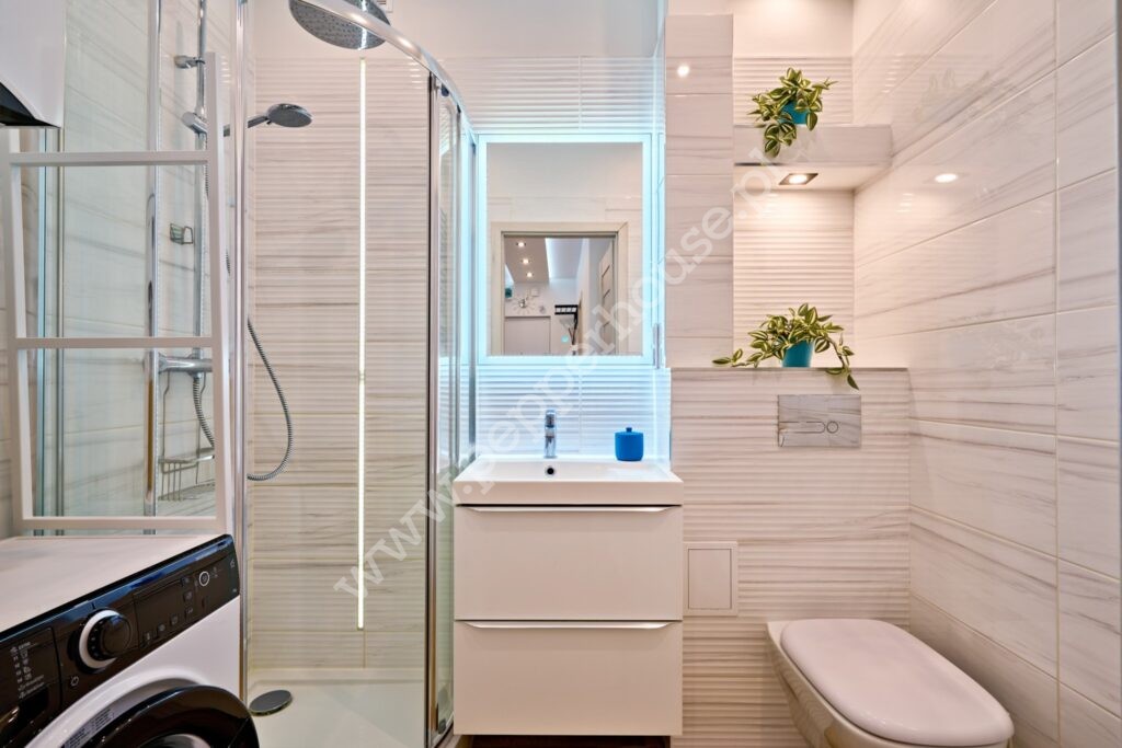 • Stylowa łazienka z kabiną prysznicową,