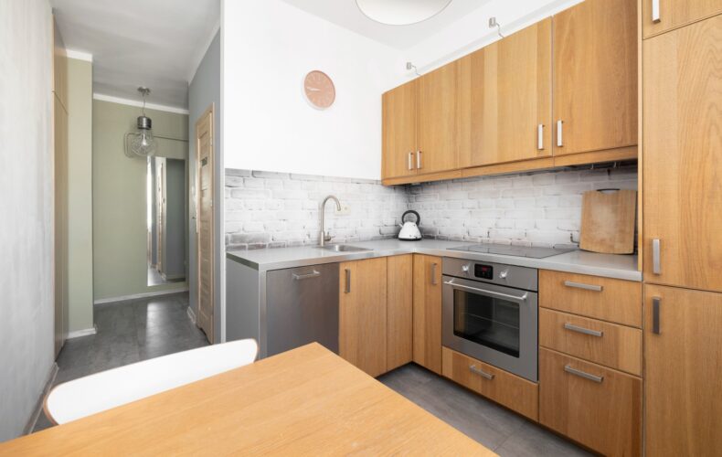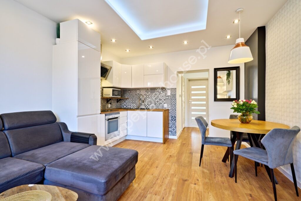 • Salon z aneksem kuchennym – nowoczesne i funkcjonalne wnętrze,