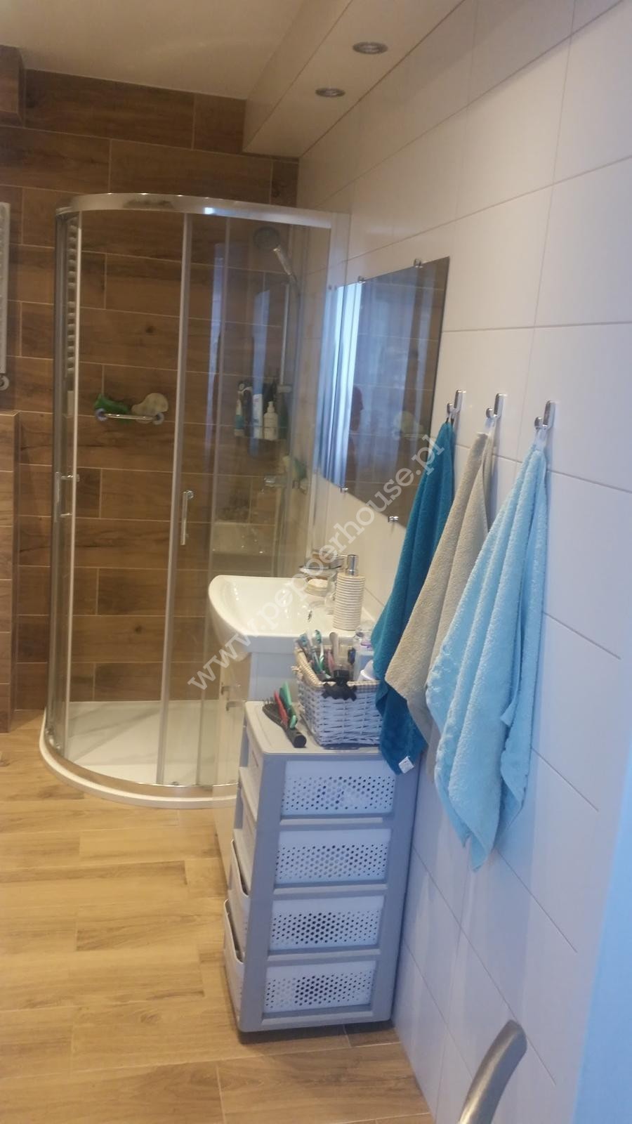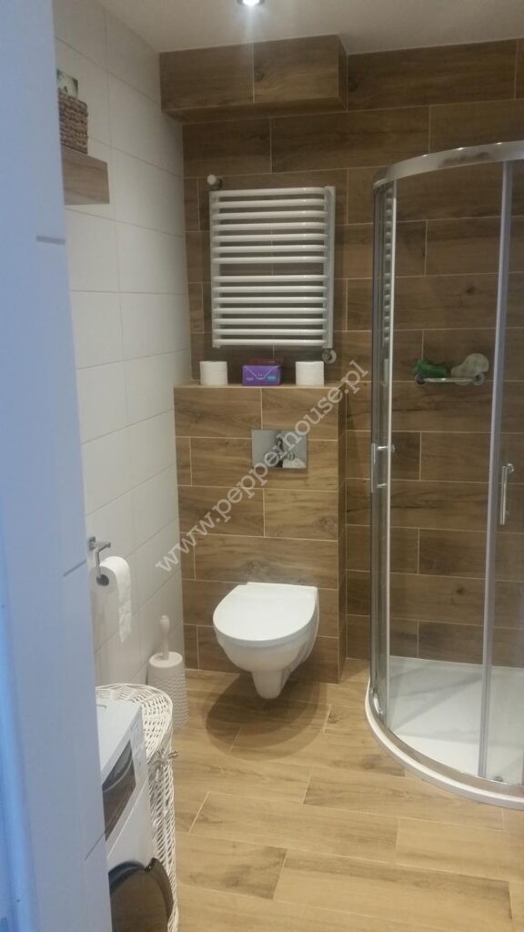 Łazienka: Powiększona, wykończona w stylu nowoczesnym. Duża kabina prysznicowa.