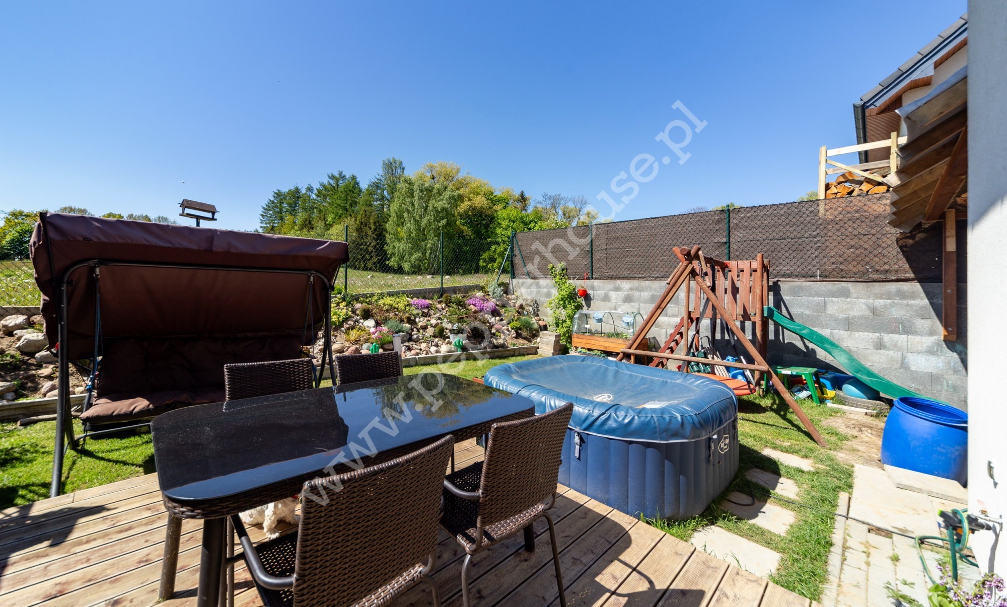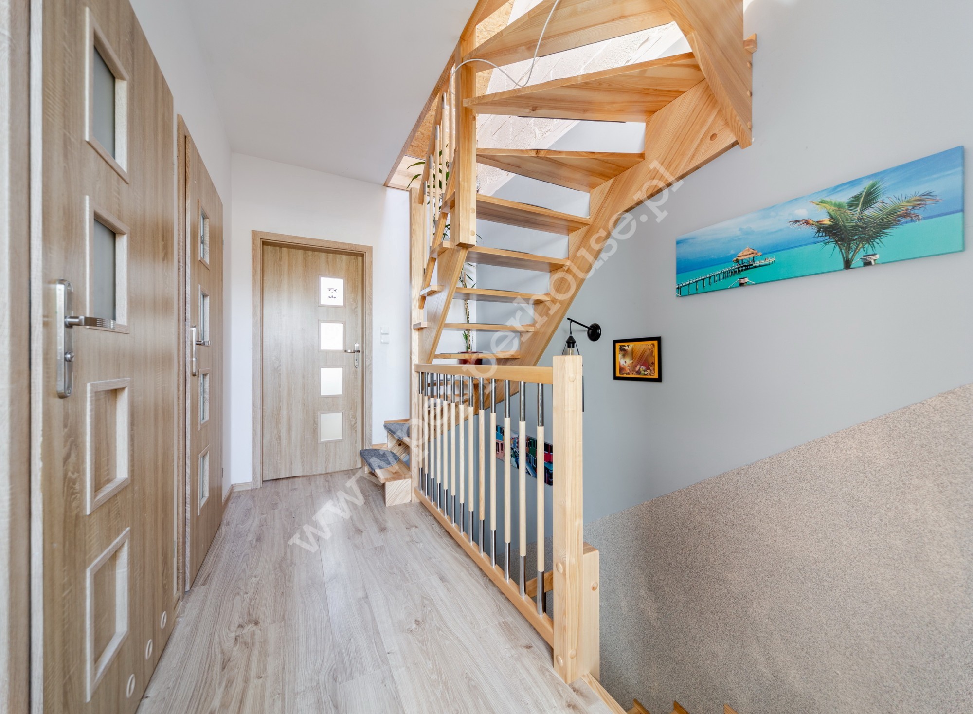 Dom w zabudowie szeregowej stworzonej z 4 nieruchomości. Nieruchomość skrajna posiada największą, ogrodzoną posesję z bramą wjazdową. Samochody możemy stawiać także na wybrukowanej części przed bramą. Dużym atutem nieruchomości jest świeżo wybudowana wiata garażowa z automatyczną bramą wjazdową, dzięki czemu nasz samochód nie musi stać na zewnątrz. Powierzchnia wiaty pozwala także na zaadoptowanie jej na mini warsztat. Poza tym do dyspozycji mamy przestronny i słoneczny ogród od strony zachodniej. Budynek wybudowany jest z gazobetonu, ocieplony 15 cm styropianem i pokryty jest dachówką.