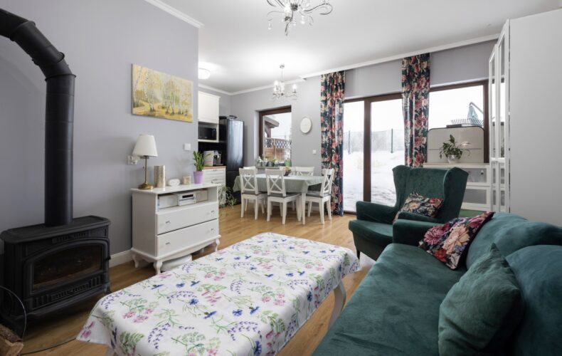 – parter z częścią wypoczynkową: hol, WC, pokój dzienny z aneksem kuchennym oraz zadbanym ogrodem z domkiem na narzędzia (około 80 m2),