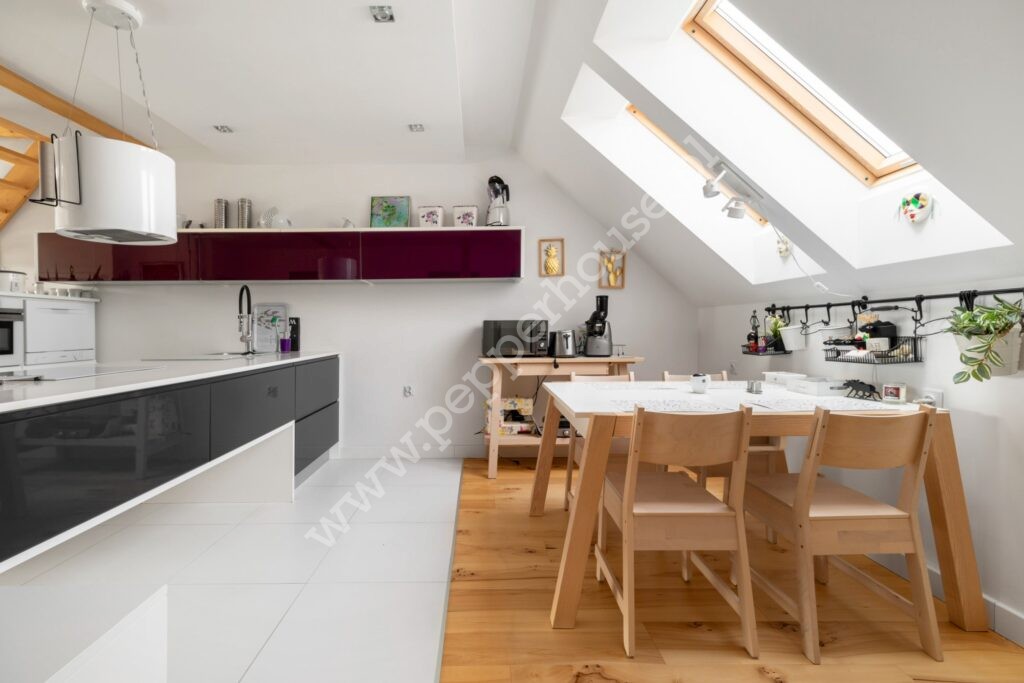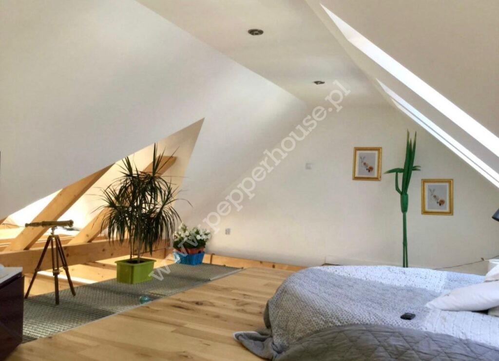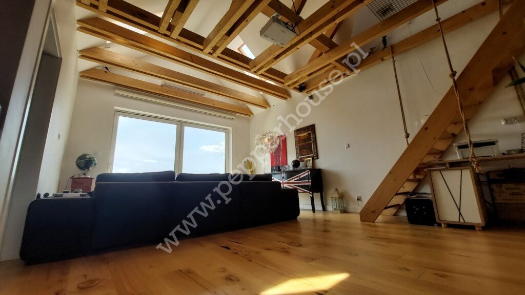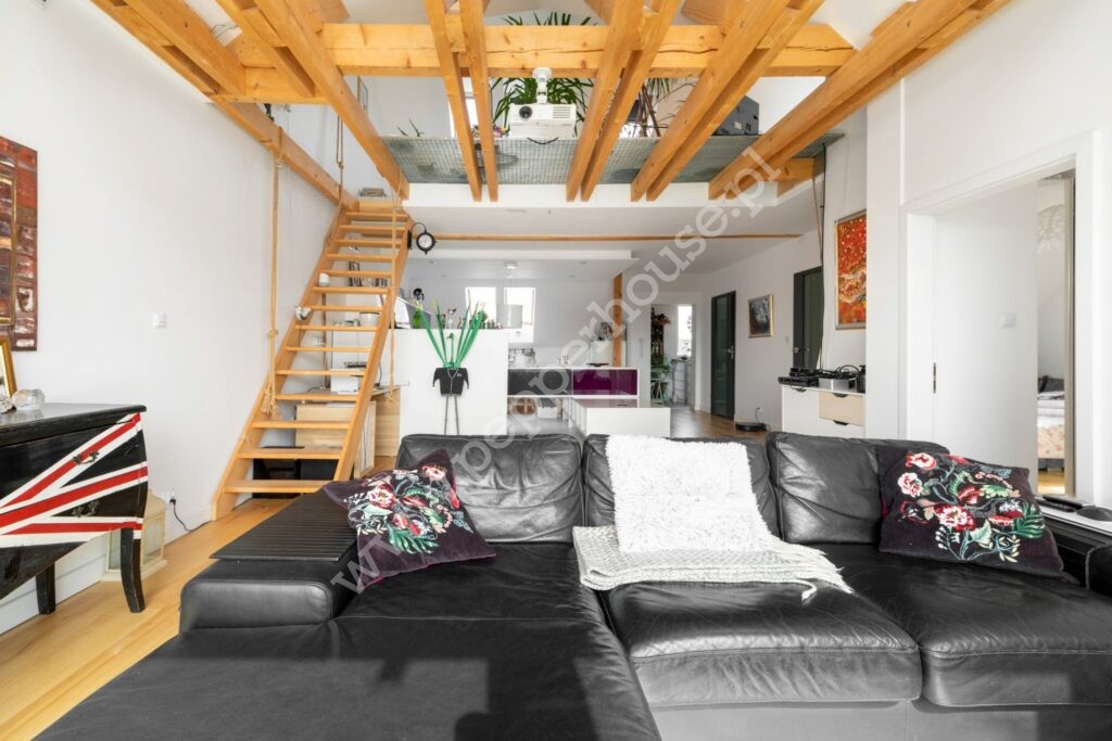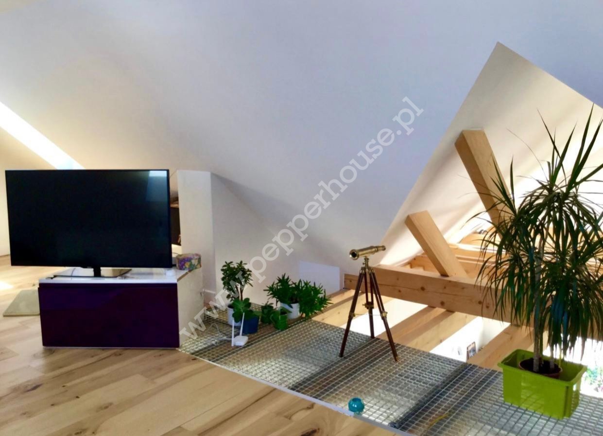 Główną cechą wyróżniającą to mieszkanie jest fantastyczna antresola, która stanowi nie tylko funkcjonalne rozwiązanie, ale również efektowny element aranżacji. Pustka nad salonem wprowadza do wnętrza mnóstwo naturalnego światła, podkreślając przestrzeń i nadając jej lekkość. A południowa ekspozycja gwarantuje znakomite doświetlenie przez cały dzień. Na antresoli znajduje się sypialnia oraz salon kąpielowy wraz z toaletą. Dodatkowa przestrzeń w szczycie dachu jest idealnym miejscem do zabaw dla dzieci.