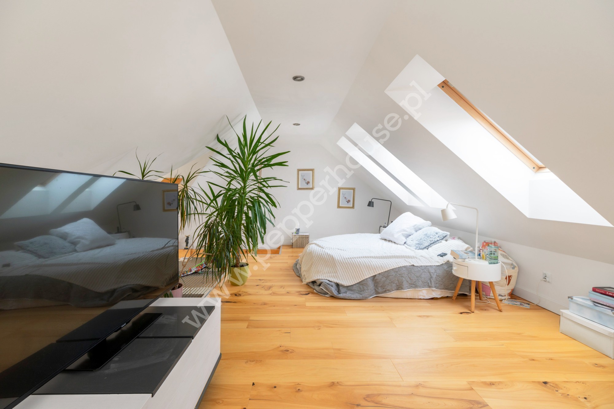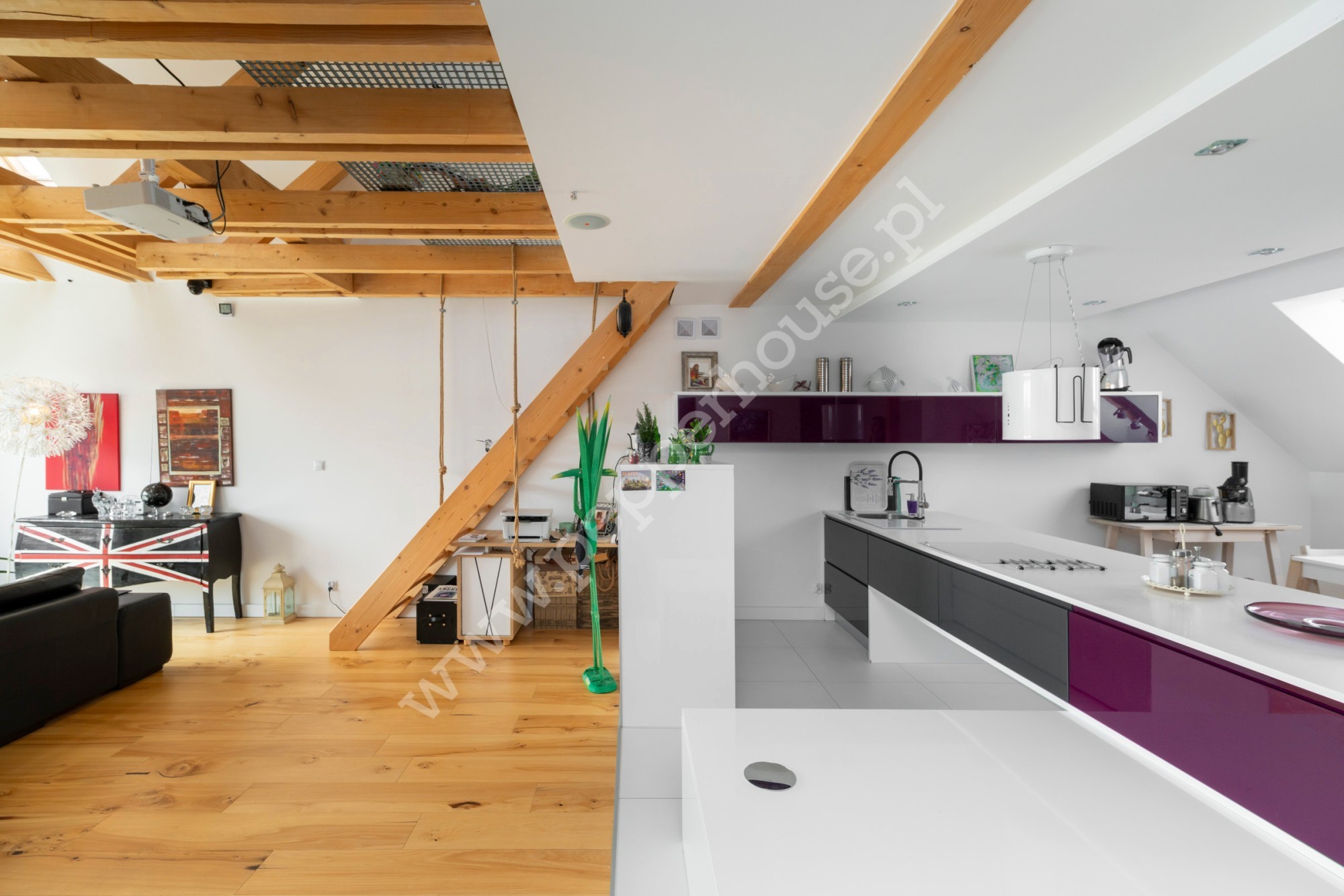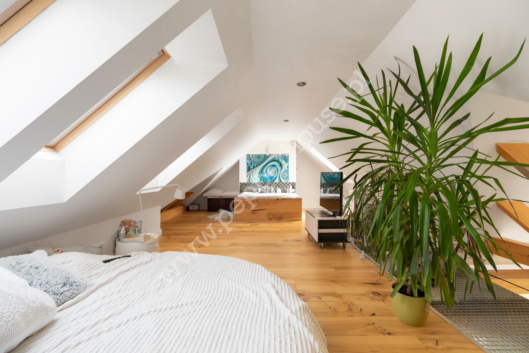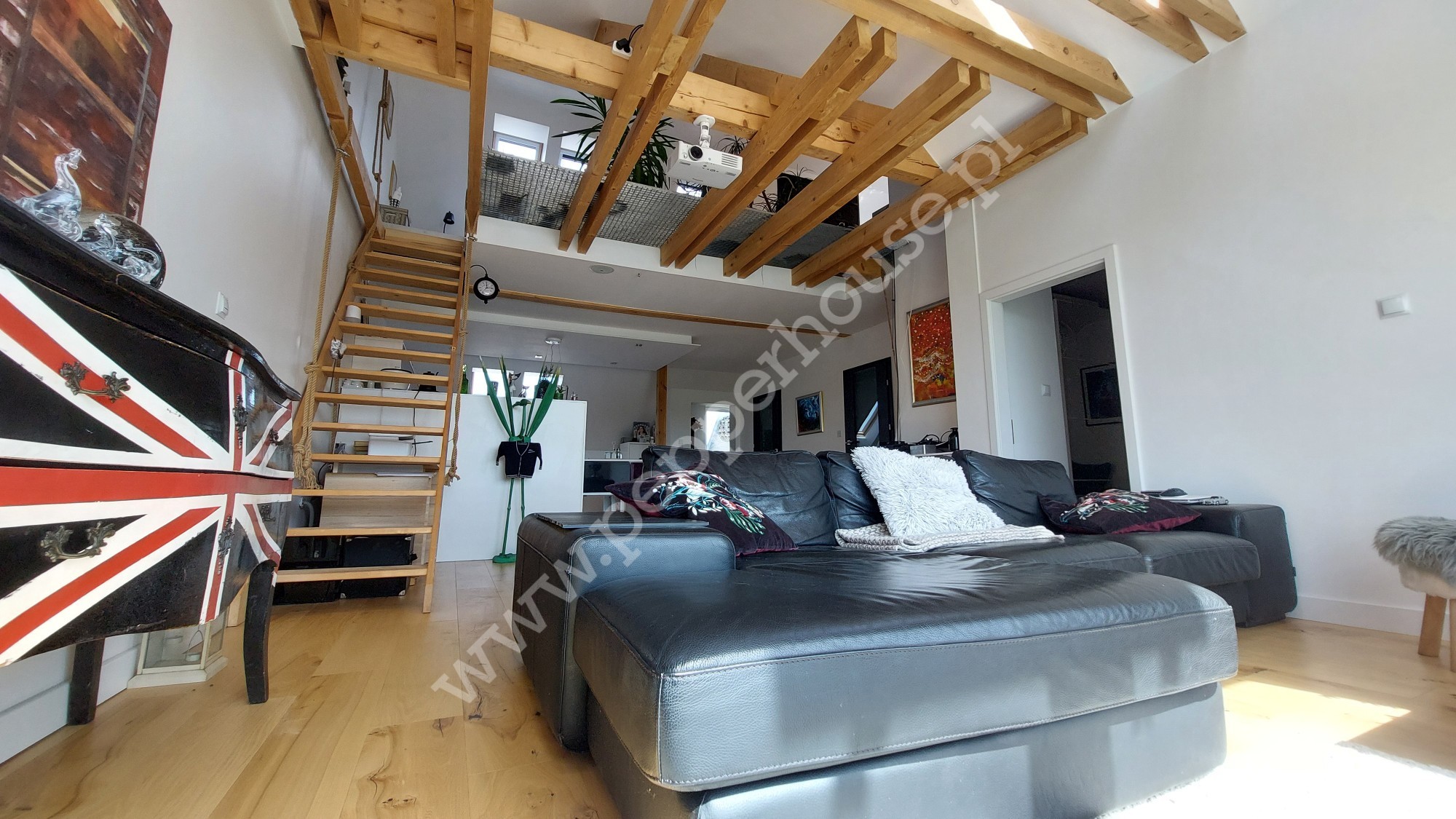 Główną cechą wyróżniającą to mieszkanie jest fantastyczna antresola, która stanowi nie tylko funkcjonalne rozwiązanie, ale również efektowny element aranżacji. Pustka nad salonem wprowadza do wnętrza mnóstwo naturalnego światła, podkreślając przestrzeń i nadając jej lekkość. A południowa ekspozycja gwarantuje znakomite doświetlenie przez cały dzień. Na antresoli znajduje się sypialnia oraz salon kąpielowy wraz z toaletą. Dodatkowa przestrzeń w szczycie dachu jest idealnym miejscem do zabaw dla dzieci.