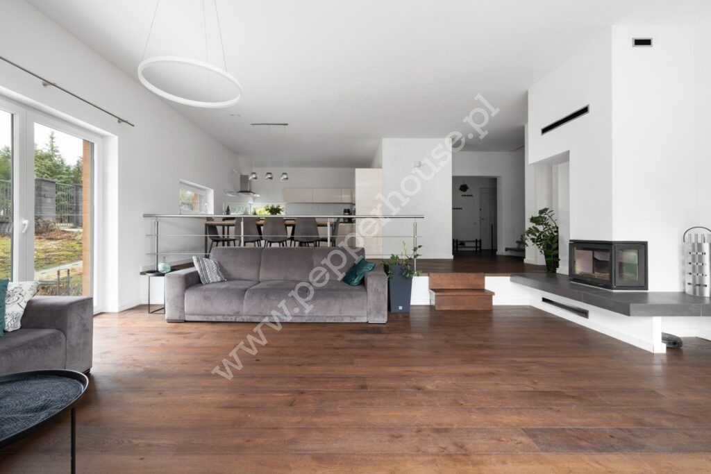 – salon z kominkiem z wyjściem na taras (wysokość 3,15m)