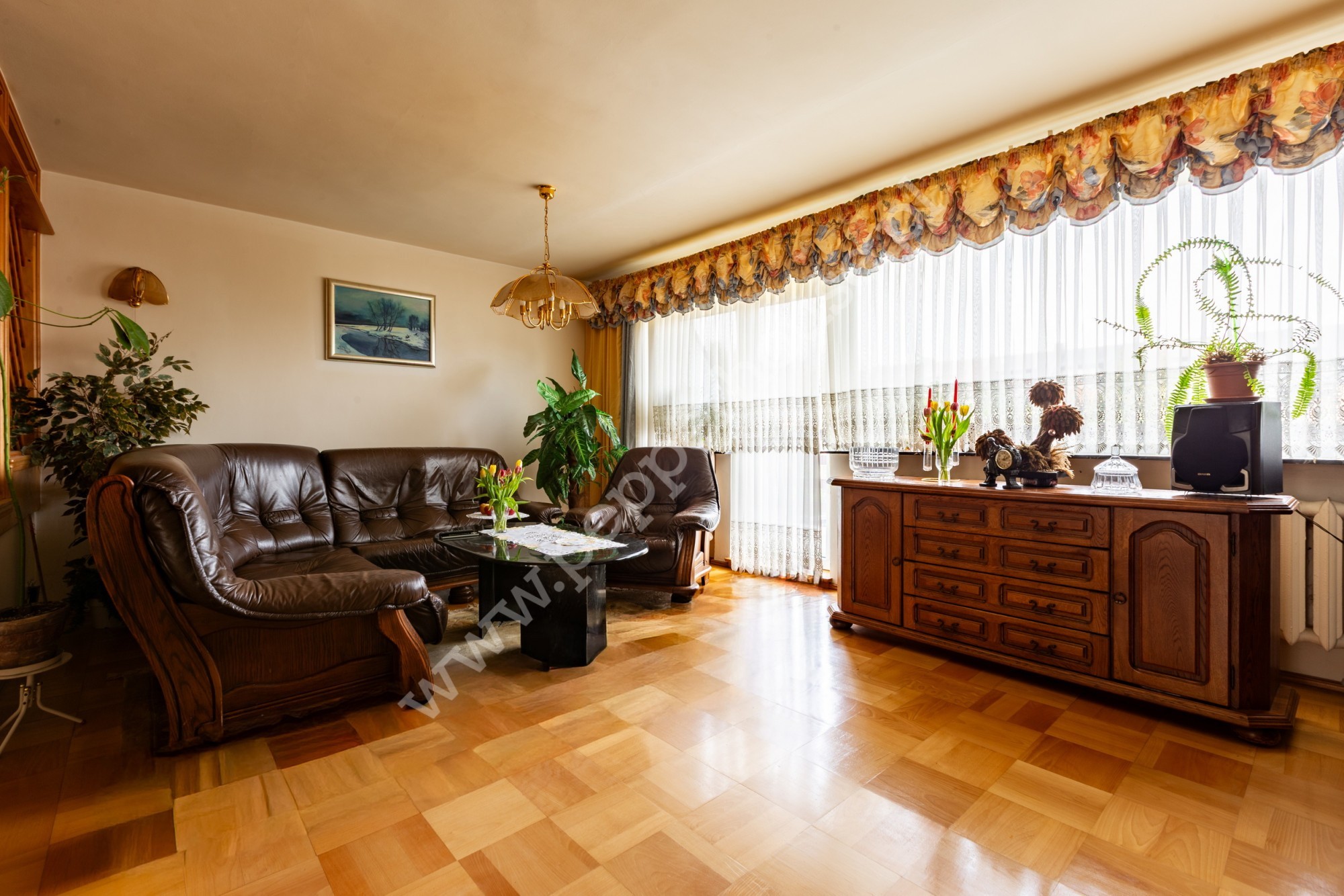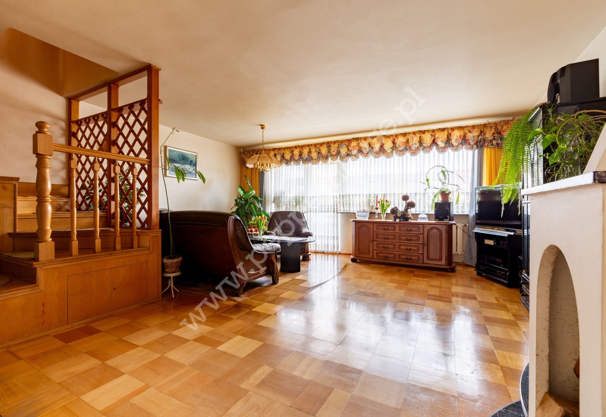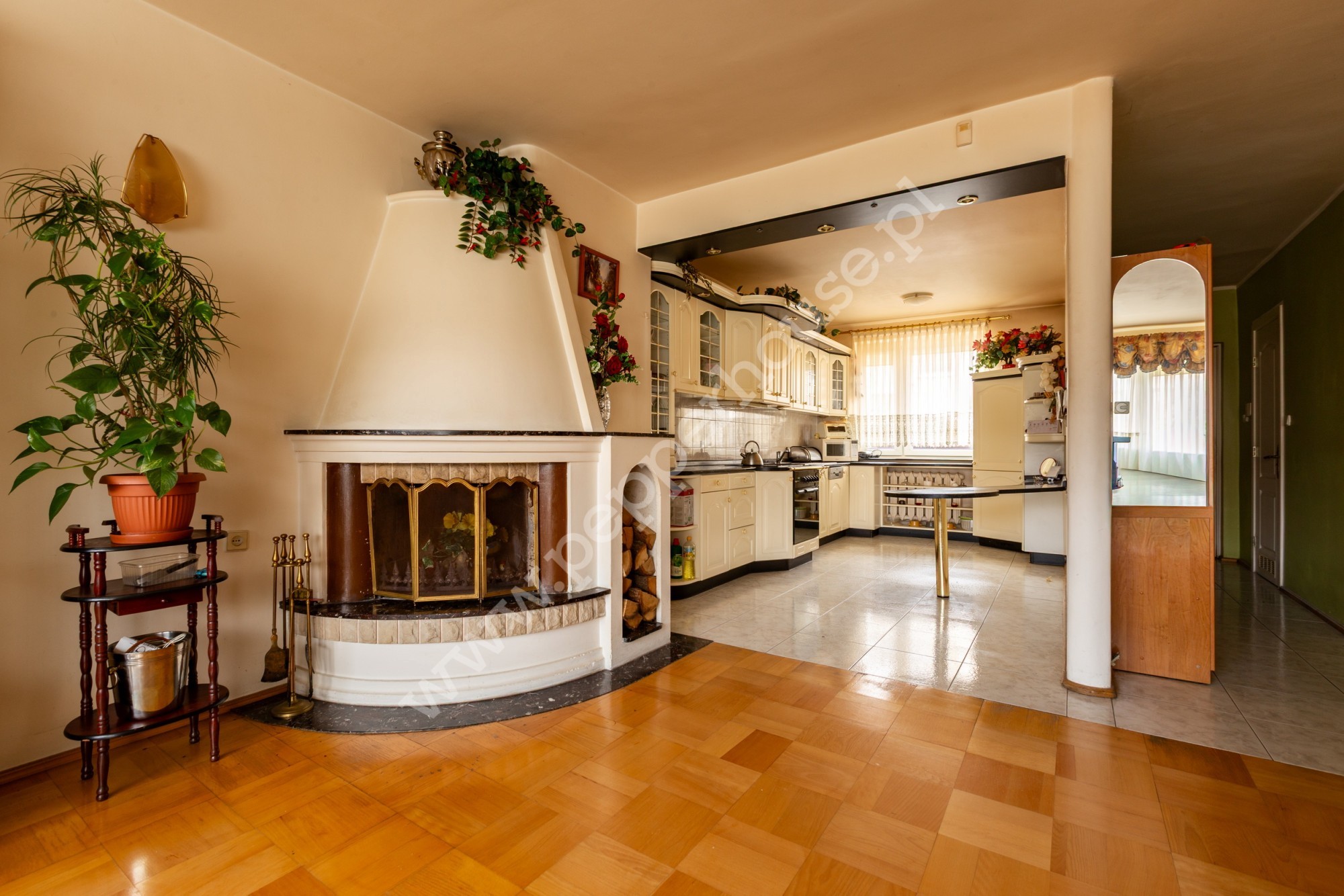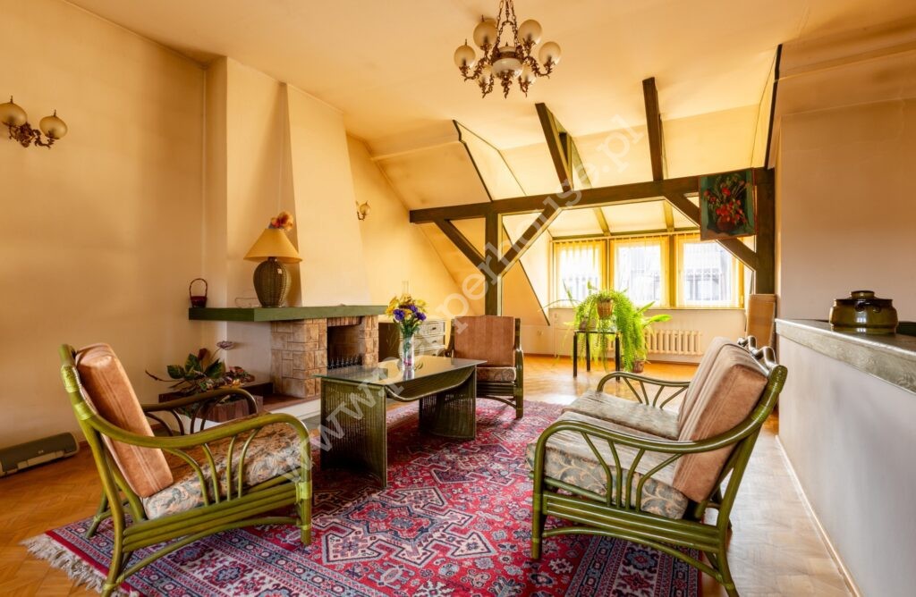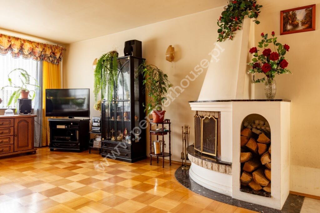 Przestronny salon z kominkiem i wyjściem na balkon