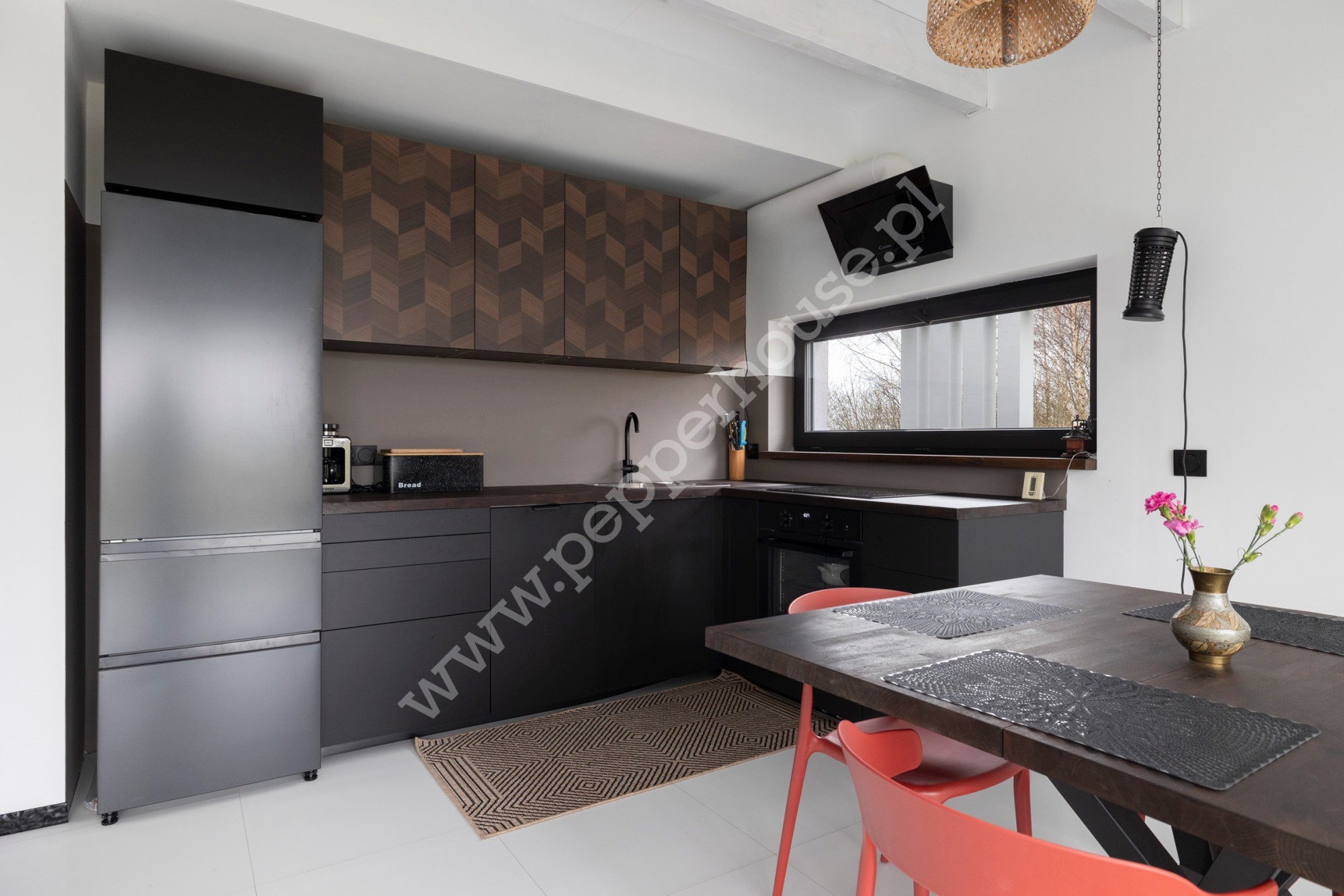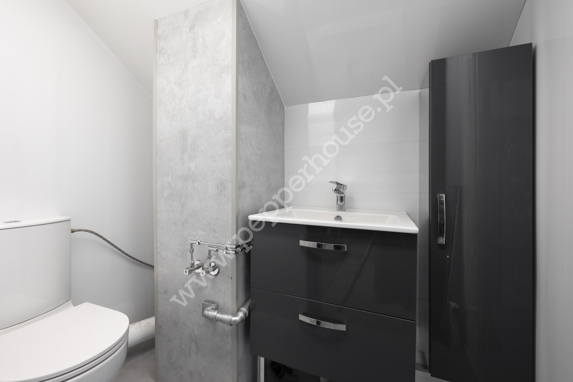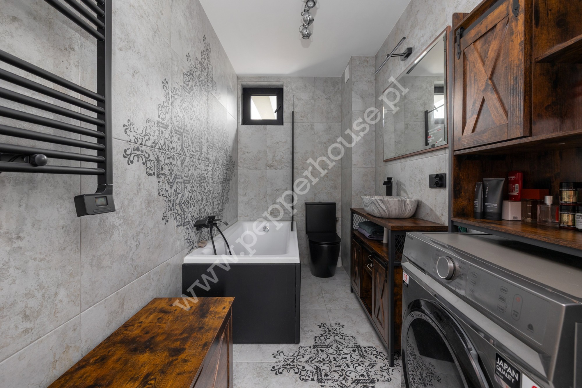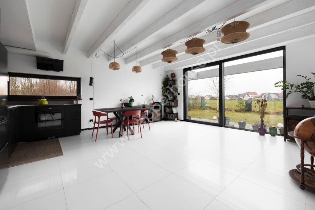 Powierzchnia użytkowa nieruchomości wynosi 85,98m2. Ogrzewanie pompą ciepła oraz podłogowe na parterze. Klimatyzacja, klimakonwektor, alarm, monitoring. Posadowienie budynku: fundament ( ława, bloczki + docieplenie styropianem 10cm). Ściany beton komórkowy/gazobeton 24cm ( 0,5m hydroizolacja zewnętrzna bloczków), ocieplenie: mury – styropian szary 15cm, dach – wełna, ściany kolankowe docieplone wełną 5cm od wewnątrz, elewacja – tynk silikonowy, baranek. Strop na belkach drewnianych.