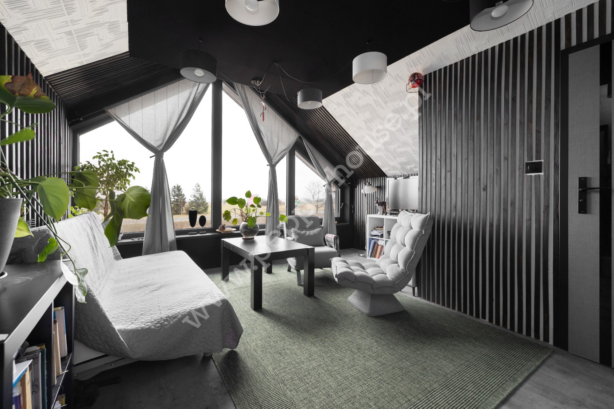 Okna tarasowe aluminiowe oraz PCV trójszybowe, dach krokwiowo-jętkowy pokryty papą i blachą na rąbek. Odprowadzenie ścieków- szambo 8m.