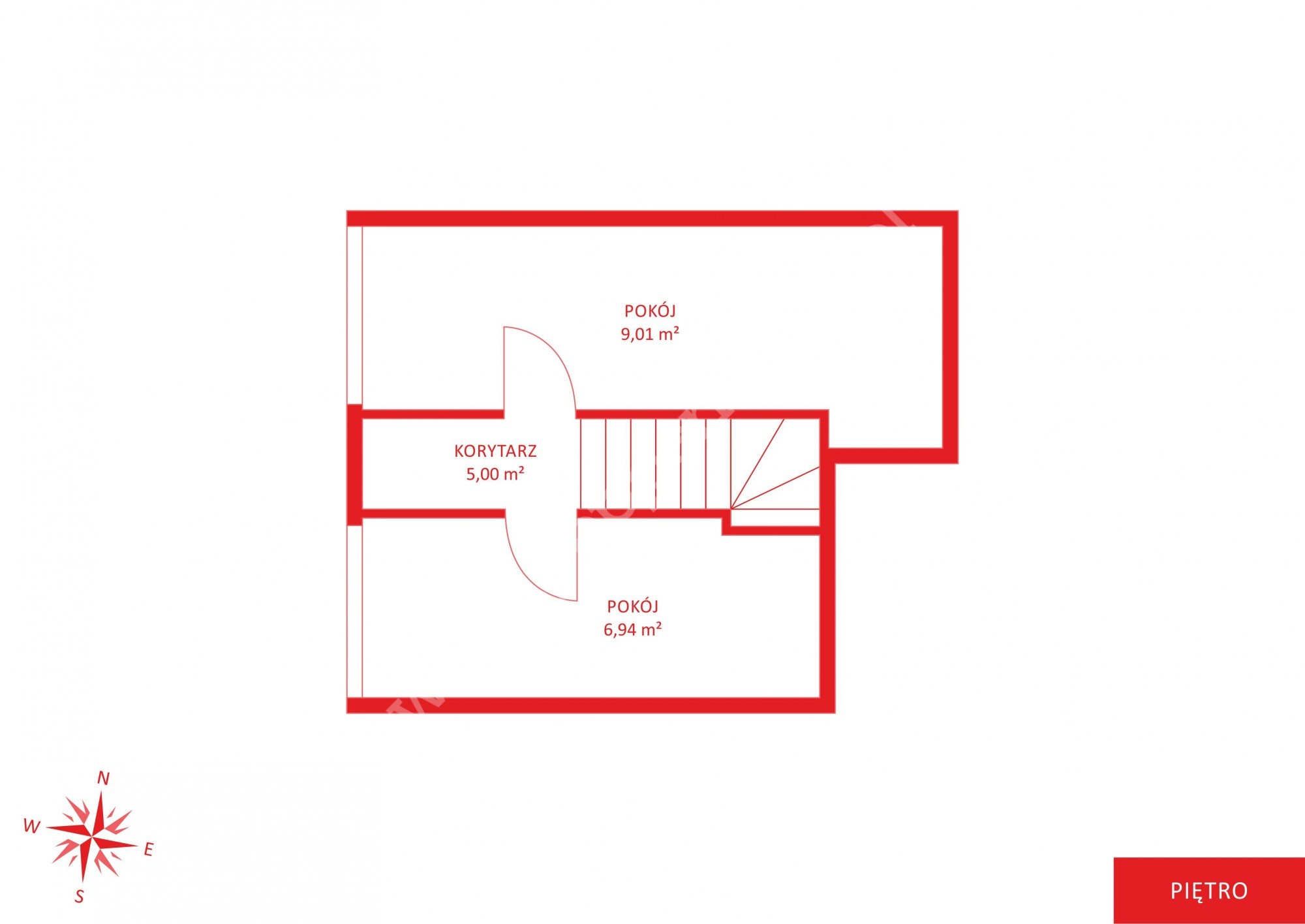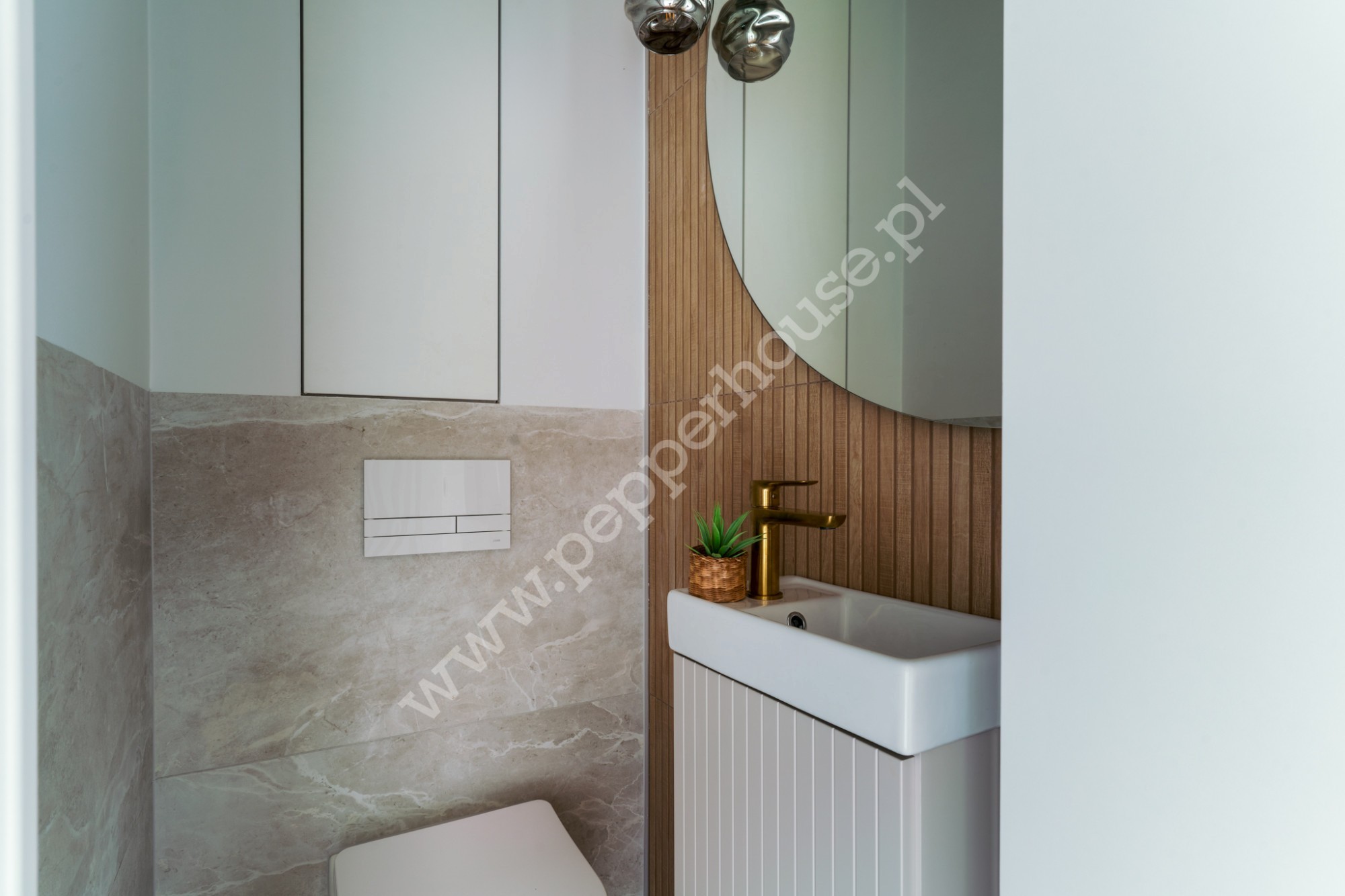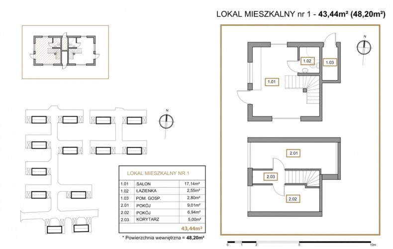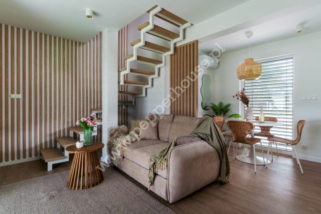Lokal o powierzchni użytkowej 43,44 m2 składa się z dwóch poziomów. Na parterze salon z aneksem kuchennym (17,14 m2), łazienka (2,55 m2), na piętrze dwa pokoje (9,01 i 6,94 m2) oraz korytarz ze schodami (5 m2) z miejscem na dużą szafę. Do każdego lokalu przynależy pomieszczenie gospodarcze (2,8 m2) z odrębnym wejściem, idealne miejsce do przechowywania rowerów i mebli ogrodowych.