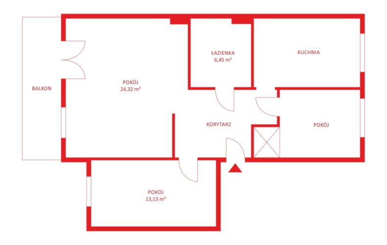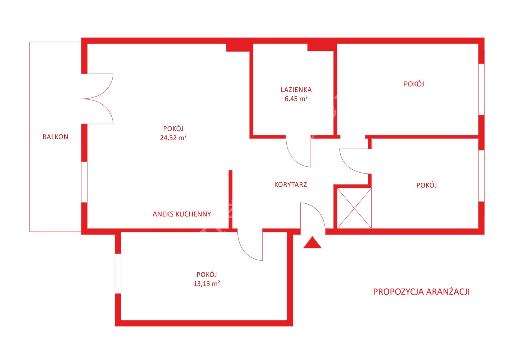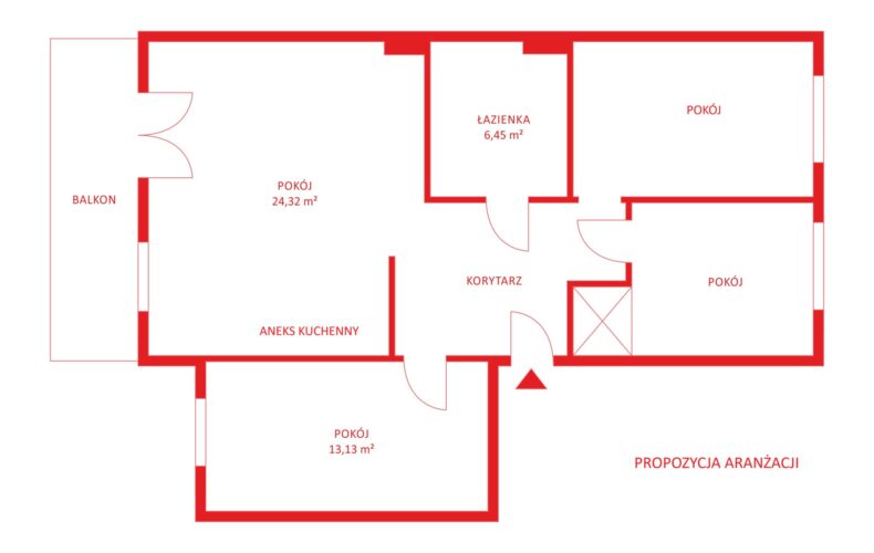 Obecnie układ mieszkania składa się z 3 dużych pokoi i niezależnej kuchni z oknem. Natomiast istnieje możliwość przearanżowania układu pomieszczeń, poprzez przeniesienie kuchni do salonu i uzyskanie dodatkowej sypialni. Przyłącza znajdują się w ścianie między salonem a sypialnią.